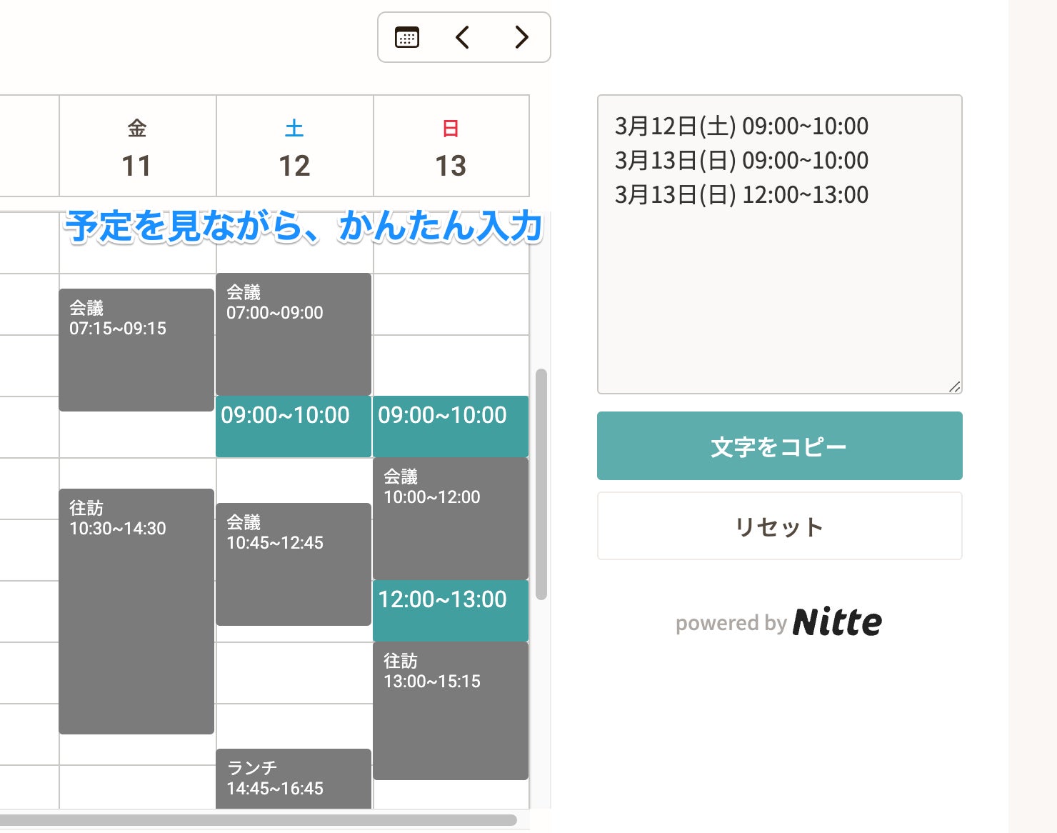 親サービス日程調整のニッテ(https://site.nitte.app/)は、日時の文字の入力だけでなく