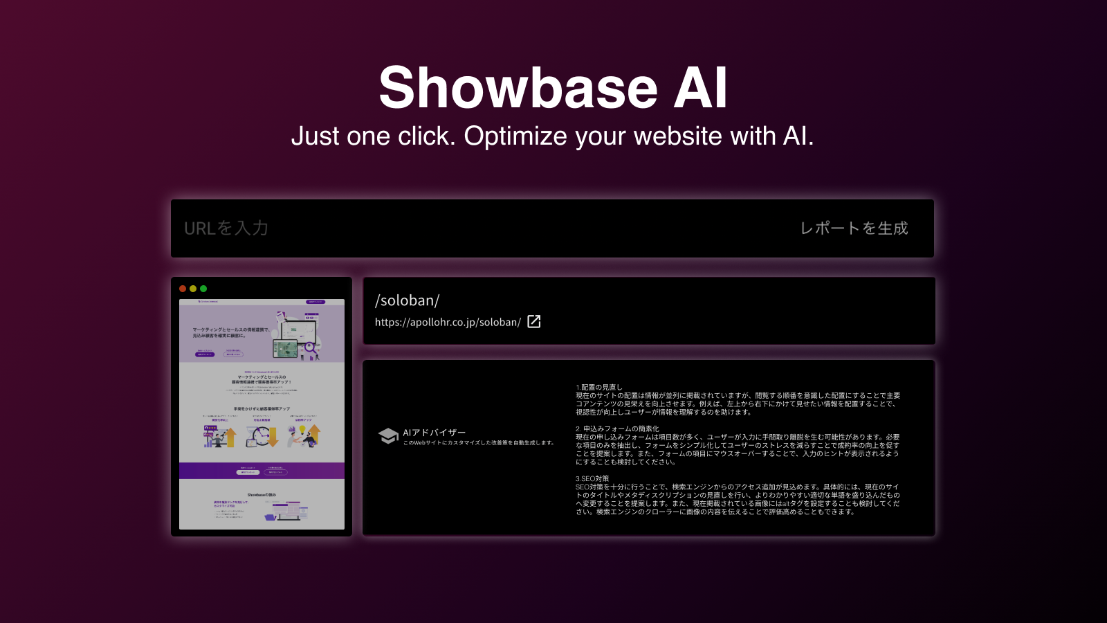 当社のShowbaseは、ビジネスのマーケティング活動をAIにより効率化し、コンバージョン率の向上をサポートすることを目的としています。ユーザーは、URLを入力するだけで簡単に動画を生成することができ、今まで取得できなかった情報に自由にアクセスし分析することができます。また自動ABテストによりコンバージョン率を向上させることができます。