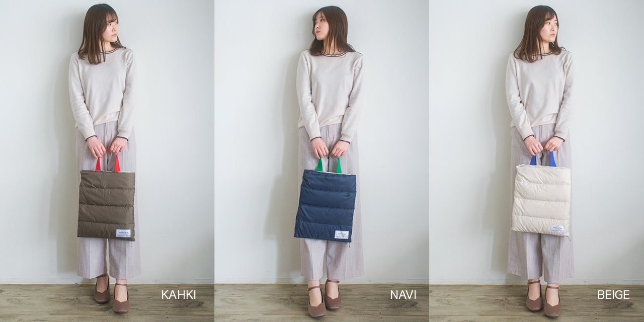 A4サイズのトートバッグに取り外せるダウンブランケットがカバーとしてついた防寒バッグです。