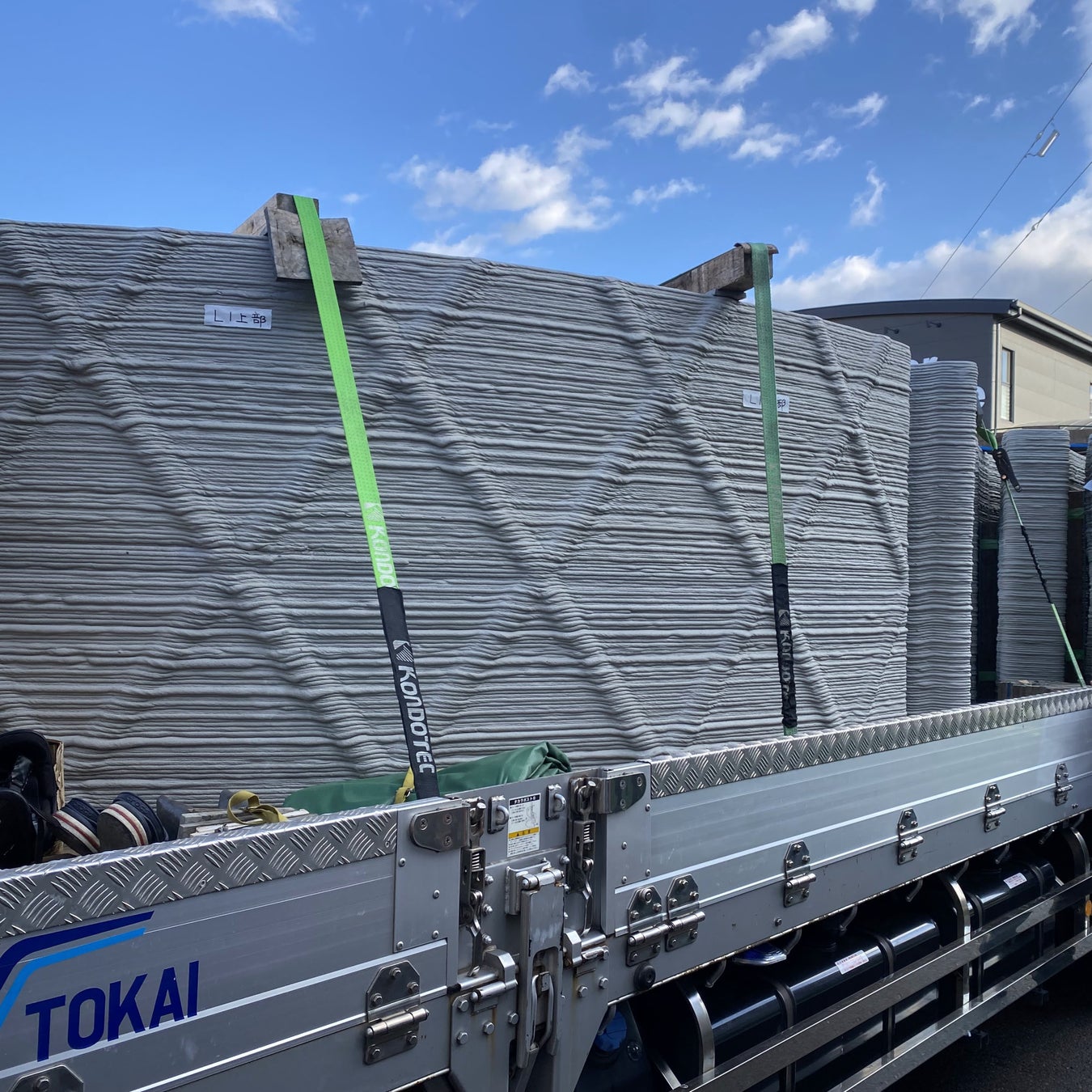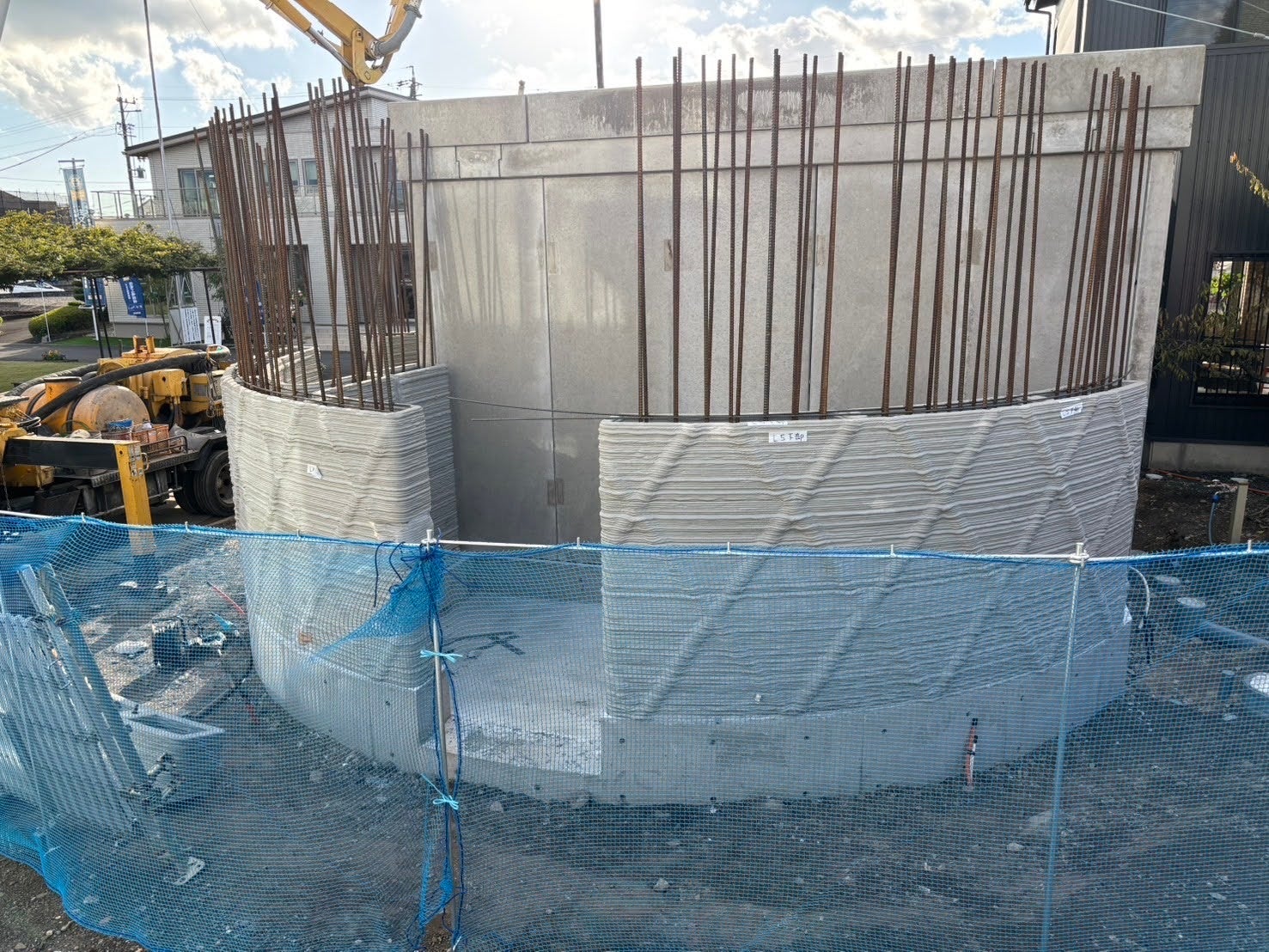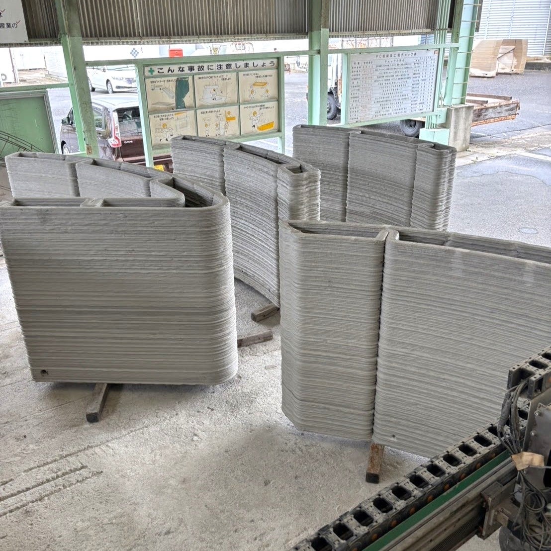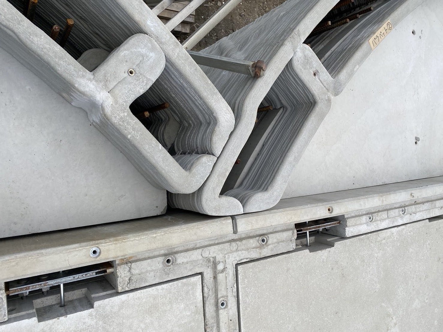 部材は共に百年住宅小牧工場(愛知県小牧市)で製作。3Dプリンター部材は13種類に分かれており、また、中空構造により軽量化も図られ、大型トラックにて容易に運搬が可能です。現地で組み立てた後に、中空部分へコンクリートと鉄筋を差し込み連結させます。