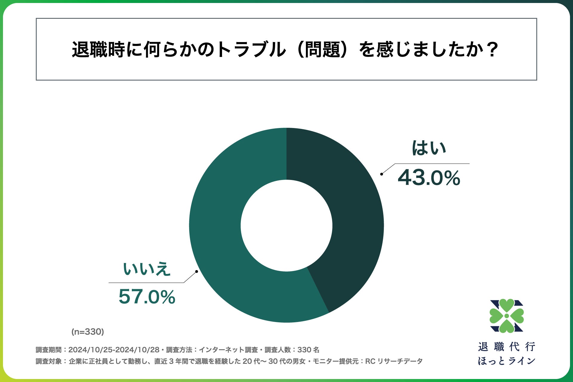 まず、「退職時に何らかのトラブル(問題)を感じたか」を尋ねる設問への回答では、「いいえ」と回答された方が57.0%と半数を上回る結果となりました。ただ、「はい」と回答された方も43.0%おり、約4割の方は退職時に何らかのトラブル(問題)を感じている、ということが明らかになりました。