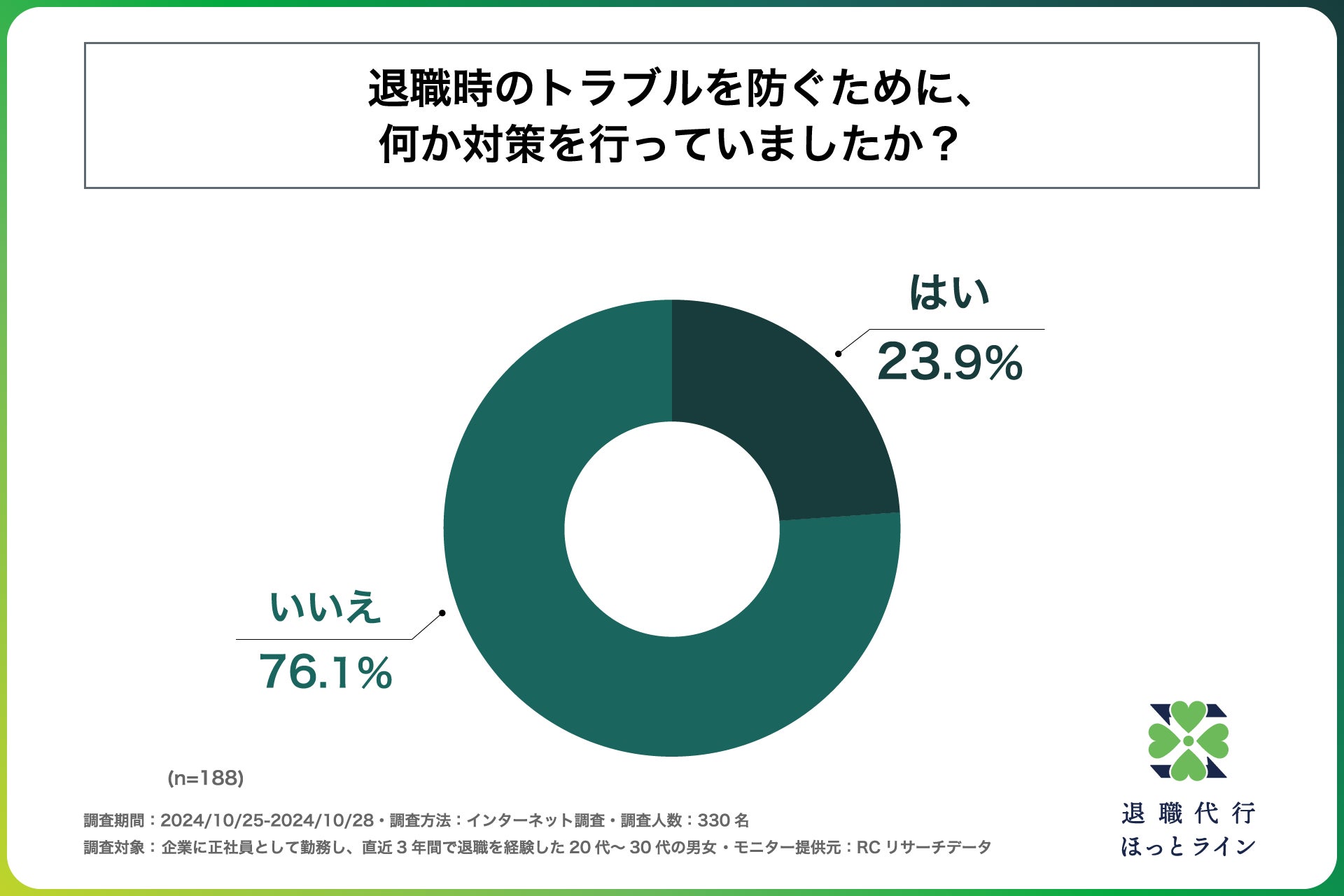 次に、最初の設問で「退職時に何らかのトラブル(問題)を感じなかった」と回答された方に「退職時のトラブルを防ぐために、何か対策を行っていたか」を尋ねる設問への回答では、「いいえ」と回答された方が76.1%と多くを占める結果となりました。この結果から、退職時のトラブルを防ぐために、何か対策を行っていた方は少数派であることが明らかになりました。