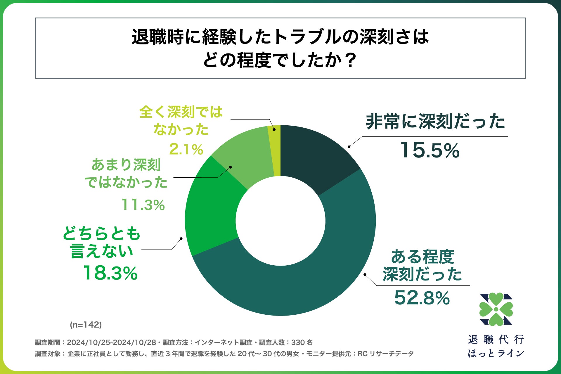 退職時に何らかトラブル(問題)を感じた方の7割弱は、退職時のトラブル(問題)に深刻さを感じている