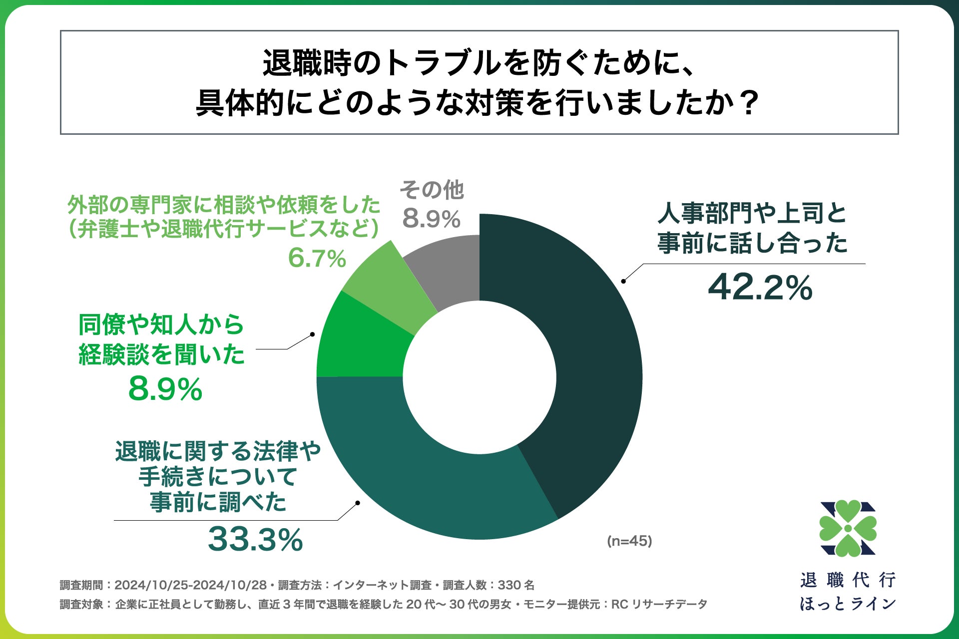 ・退職時のトラブルを防ぐ対策として多いのは「人事部門や上司との事前の話し合い」と「退職に関する法律や手続きの情報収集」