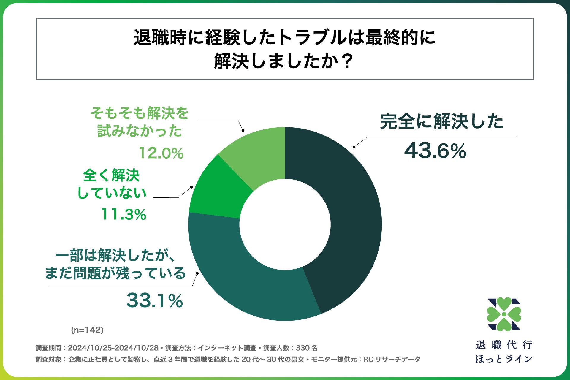 また、「退職時に何らかのトラブル(問題)を感じた」と回答された方に「退職時に経験したトラブルは最終的に解決したか」を尋ねる設問への回答では、1位が「完全に解決した」で43.6%、2位が「一部は解決したが、まだ問題が残っている」で33.1%という結果になりました。この結果から、約4割の方は退職時のトラブルは完全に解決したものの、残りの約6割の方は退職時のトラブルは解決しないままであることがわかりました。