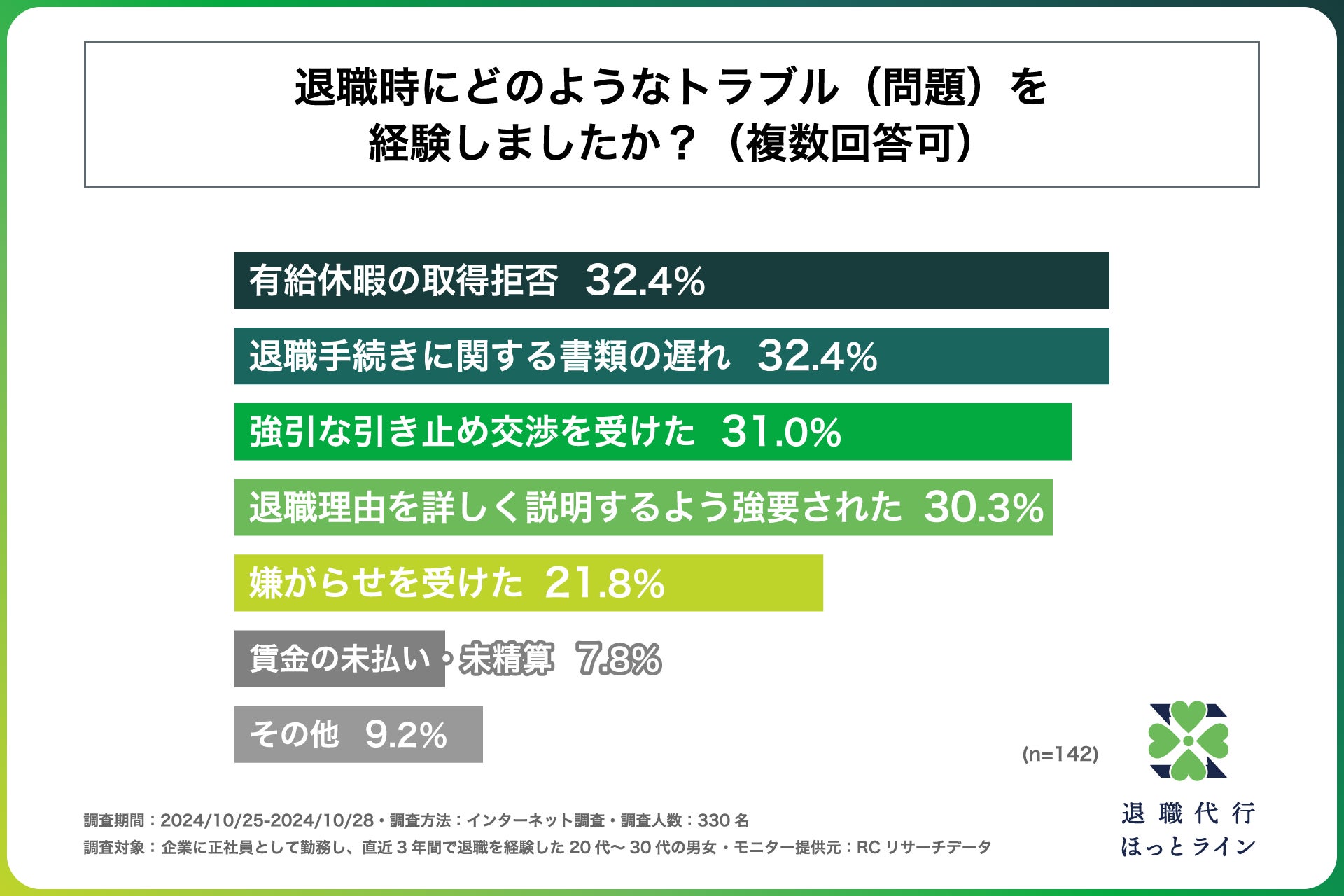退職時に感じたトラブル(問題)で多いものは「有給休暇の取得拒否」と「退職手続きに関する書類の遅れ」