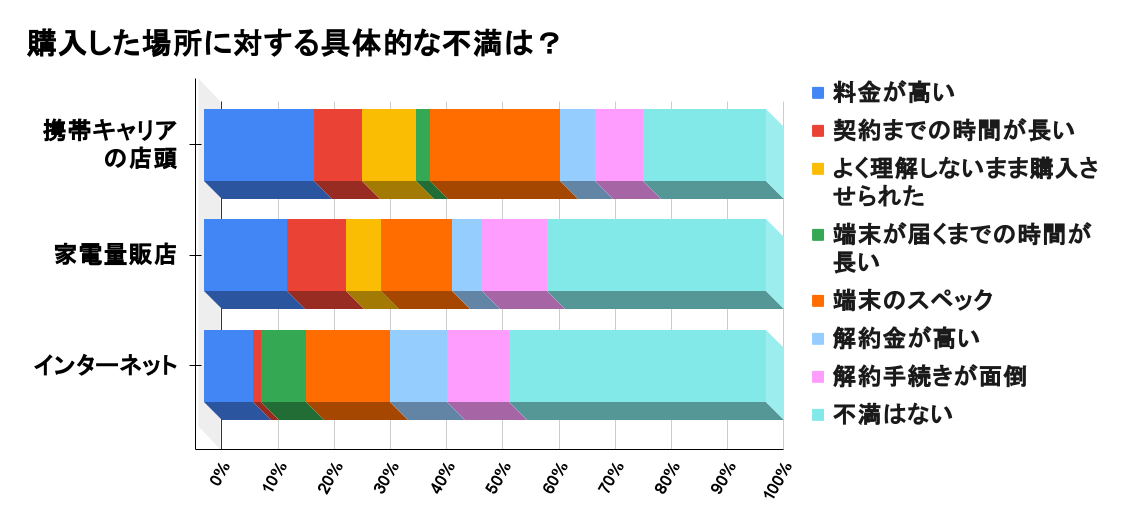 一方で、実店舗での購入よりインターネットの購入で大きく不満が目立ったのは「端末到着までの時間」「解約金」です。
