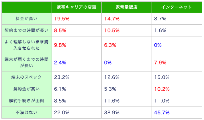 それに比べて、インターネットの購入で多い不満は「端末が届くまでの時間が長い」「解約金が高い」という結果となりました。