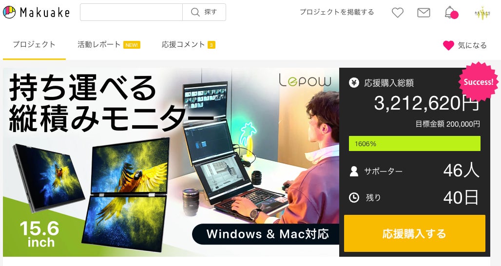 販売開始初日で応援購入総額なんと300万円超!Makuake様全体の「今日のランキング」において堂々の1位を獲得!!脅威の支持を集める話題のプロダクトがついに登場!