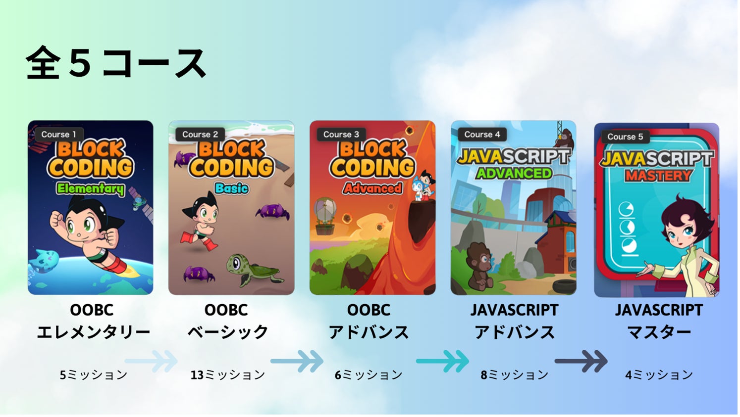 ACGのカリキュラムは、「ブロックベースプログラミング」3コース、「JavaScriptプログラミング」2コースの全36ミッションで構成され、合計で約88時間分の豊富な学習内容を備えています。どのミッションにも、SDGsやSTEM教育の要素がふんだんに盛り込まれ、ミッションをクリアしていきながら、同時に社会的な問題への関心や課題解決の道を探る意識を育てていくことができます。