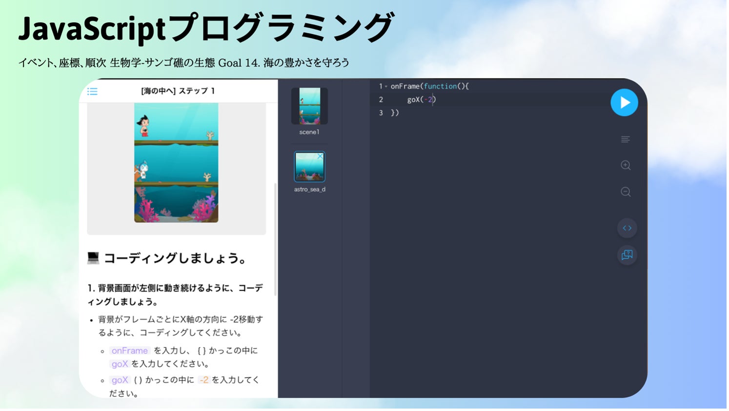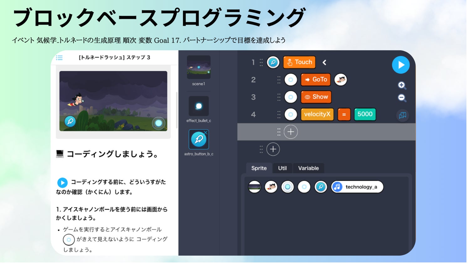 ACGの最大の特長は、単にキャラクターを活用してプログラミングを学ぶだけでなく、アニメ『Go! Go! アトム』がテーマとしている地球環境に対するアプローチを、そのまま学習のなかに組み込んでいることにあります。プログラミングを学びながら、気がついたらSDGsの価値観やSTEM教育*3の世界に子どもたちが入りこんでいくようにデザインされており、総合的な学習のための教材としての側面も持っています。