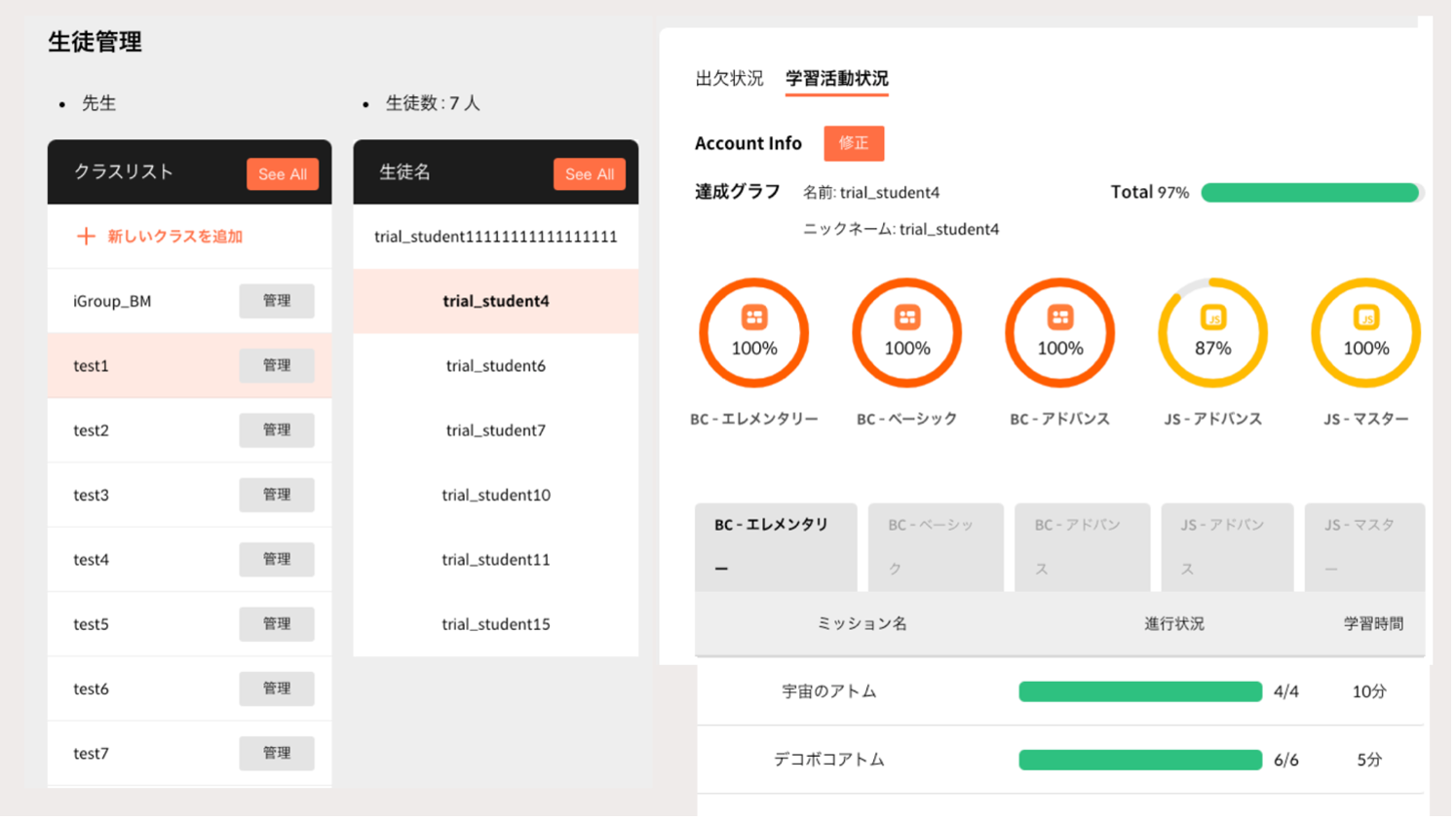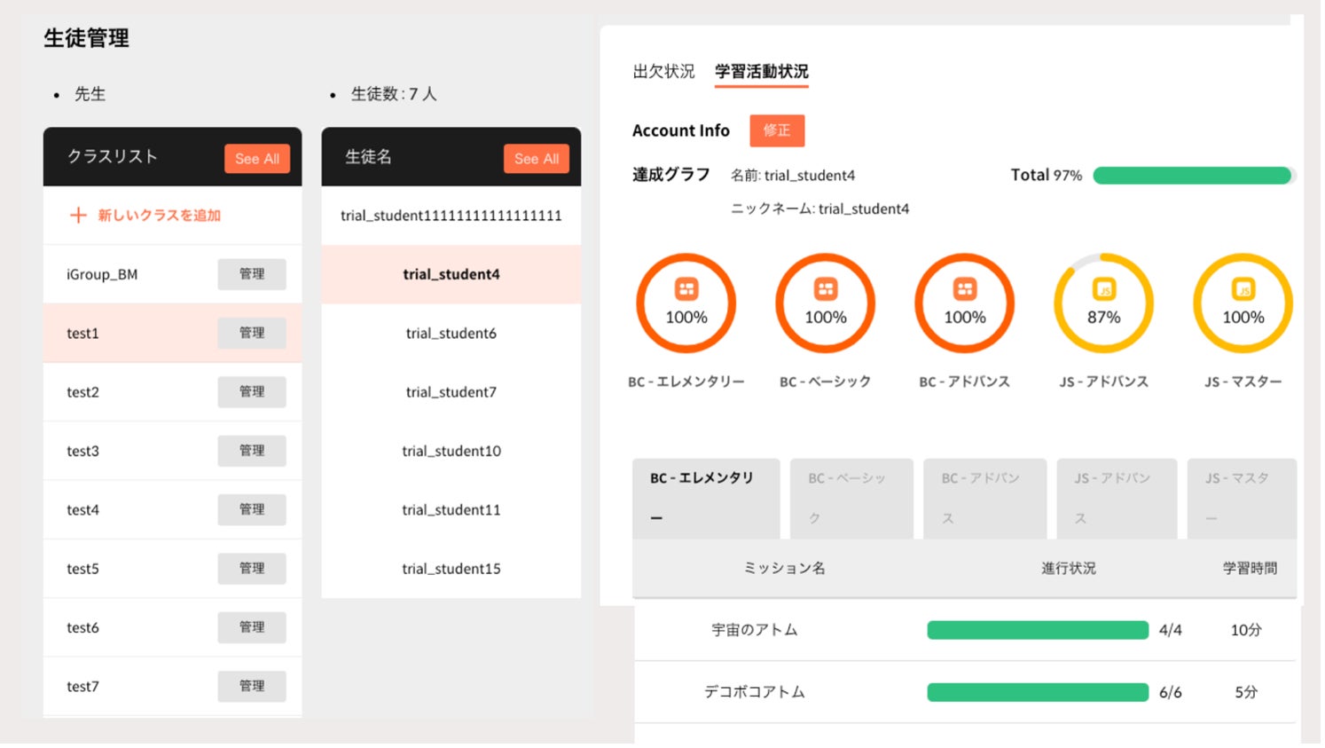 指導者向けのLMS(学習管理システム)も完備しています。一人ひとりの出席状況や学習の進捗状況を一元的に管理でき、進度に応じて個別にコースやミッションを指示することもできるため、個別最適化学習を提供することができます。