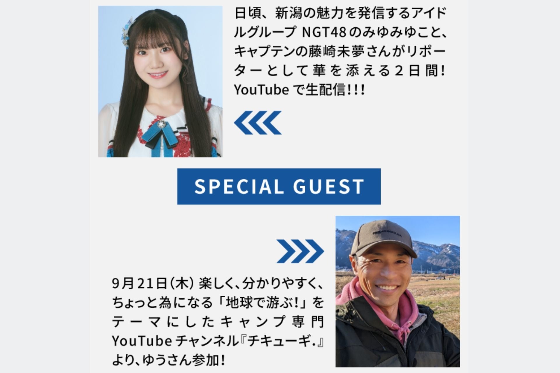 今年は、NGT48の藤崎未夢さんがリポーターをする2日間!また、9/21(木)は、キャンプ専門YouTubeチャンネル『チキューギ.』 ゆうさんのコンテンツもご用意。当日はYouTubeで生配信を予定しており、会場でもオンラインでも楽しんでいただける2日間です。