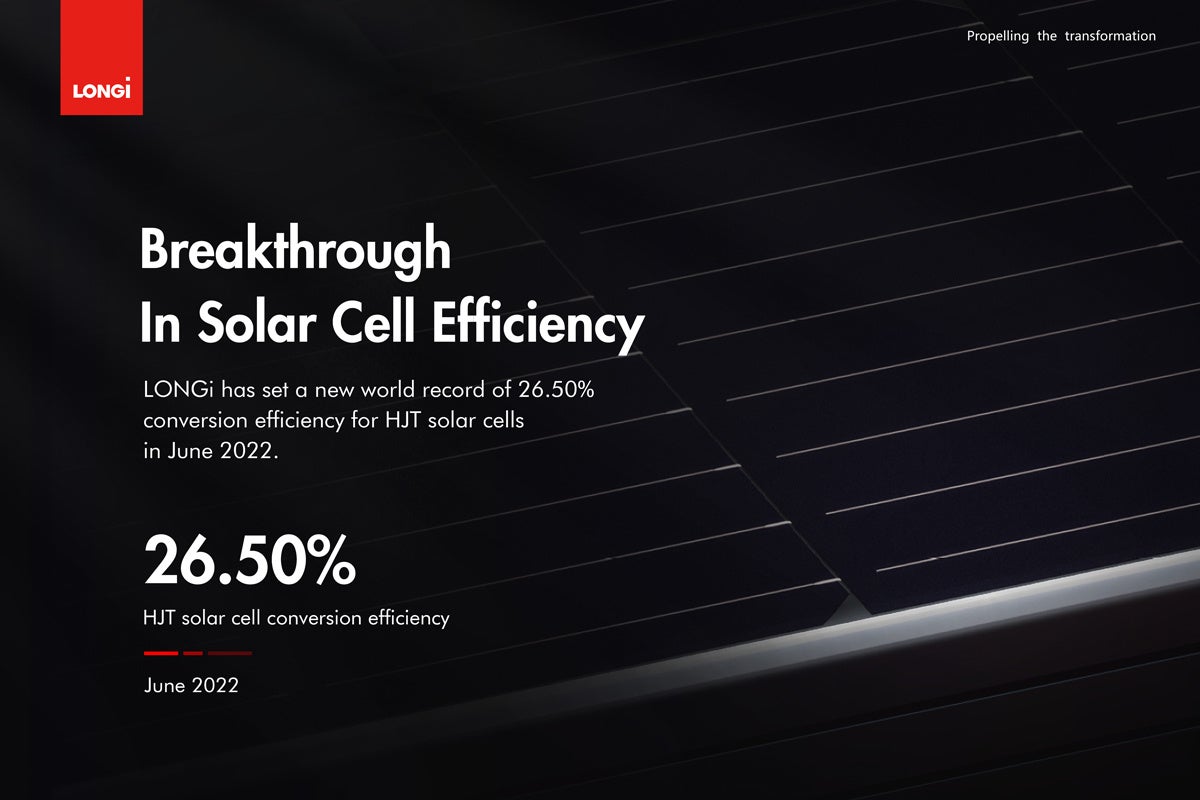 LONGi(ロンジ、本社:中国西安市)は、シリコンヘテロ接合技術(HJT)太陽電池の変換効率の世界新記録、26.50%を達成しました。