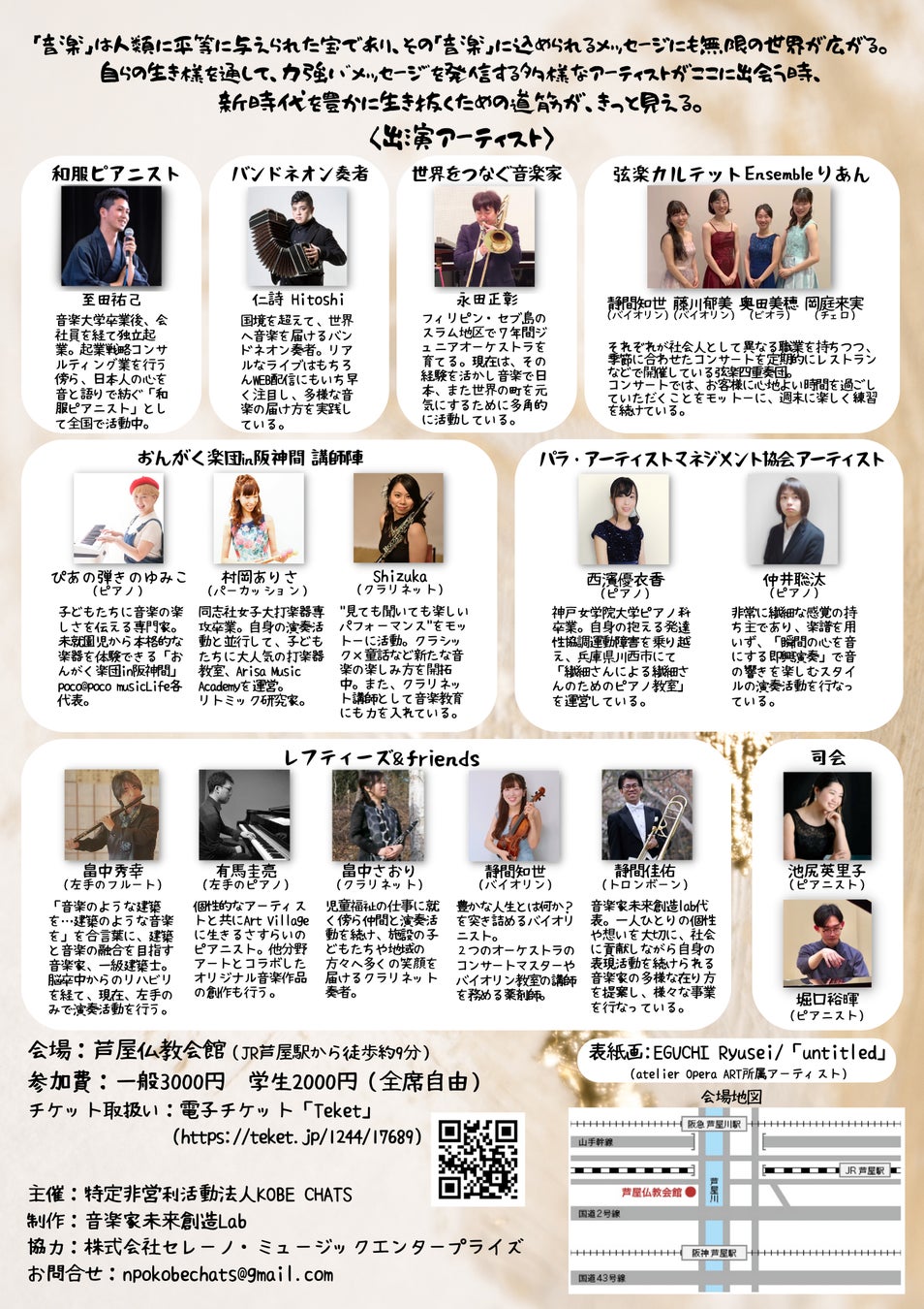 また、このイベントの制作を行なっている音楽家未来創造Lab(運営:NPO法人KOBE CHATS)では、音楽を通した社会問題へのアプローチを行なっている音楽家と、様々な業界の問題解決を目指す他業種の専門家が共に意見を出し合い、音楽を通した社会問題に対するソリューションの提案、実践を目指すために、定期的な交流やディスカッションなどの活動を行なっています。このような活動にご興味のある方からのご連絡もお待ちしております。