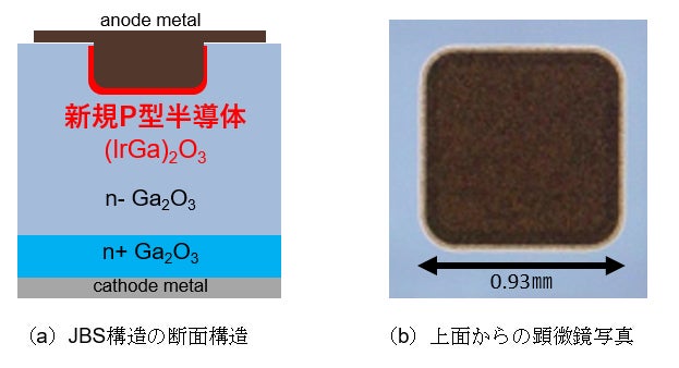 株式会社FLOSFIAでは、最先端のシリコンカーバイド(SiC)ダイオードでも用いられているJBS構造を酸化ガリウムデバイスに適用し、酸化イリジウムガリウム(α-(IrGa)2O3)薄膜をP型半導体層として埋め込み成長することで、ジャンクションバリア効果によるリーク電流抑制の実証に世界で初めて成功しました。