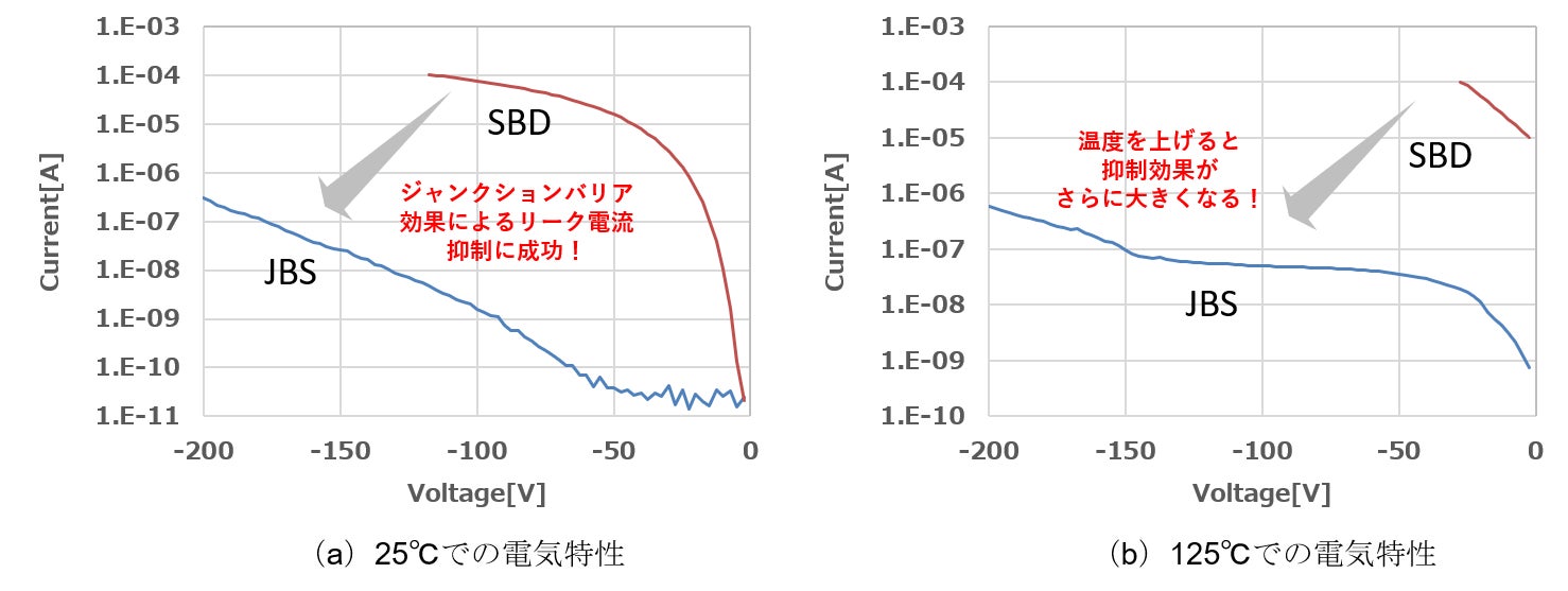 その後、作製したJBS構造チップに逆方向電圧を印加し、酸化イリジウムガリウムの埋込構造によるリーク電流の抑制効果を確認しました(比較対象には、同一ウエハ内に作製したSBDを使用)。また、温度を25℃から125℃に上げたとき、さらに抑制効果は大きくなることを確認しました。