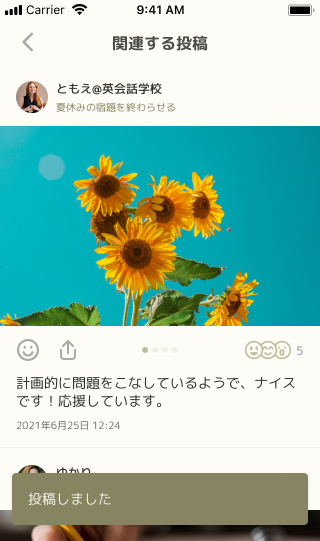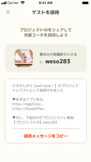 プロジェクト単位で、スポーツクラブのコーチ、家庭教師や塾の先生、祖父母、親戚などを招待し、子供の頑張りを一緒に見守り、応援するための機能です。招待されたゲストは、ダイアリーを活用して子供を応援したり、アドバイスを送るなどの遠隔でのコミュニケーションを簡単に行う事ができます。