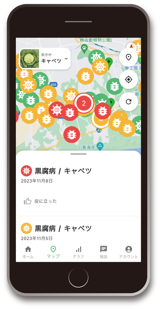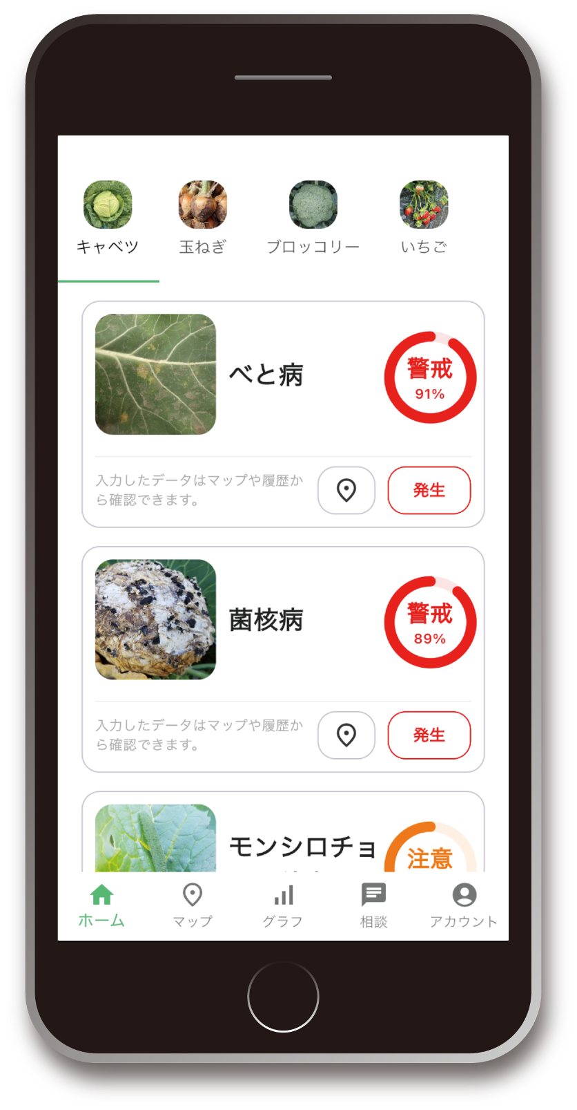 2022年からは愛知県、群馬県の農協(JA)と連携し、約50軒の農家で実証実験を実施。AI予報を活用した防除により、若手ブロッコリー農家の収量が15%増加、ベテランキャベツ農家の収量が4%増加するなど、開発段階から大きな成果を上げています。