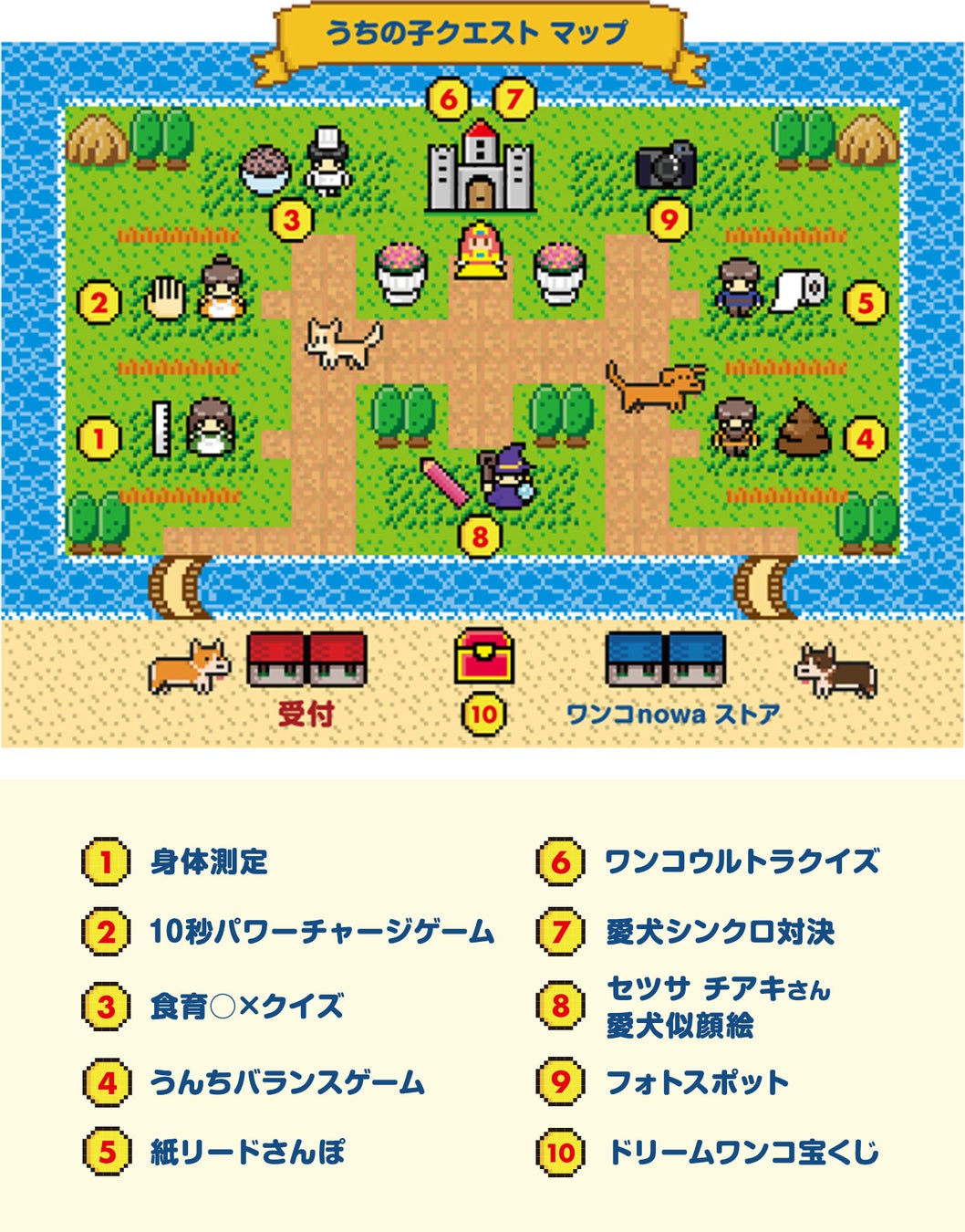 エリアの中に入ると「10秒パワーチャージゲーム」「うんちバランスゲーム」「食育早押しクイズ」など、愛犬と一緒にトライできるゲームが7つあります。