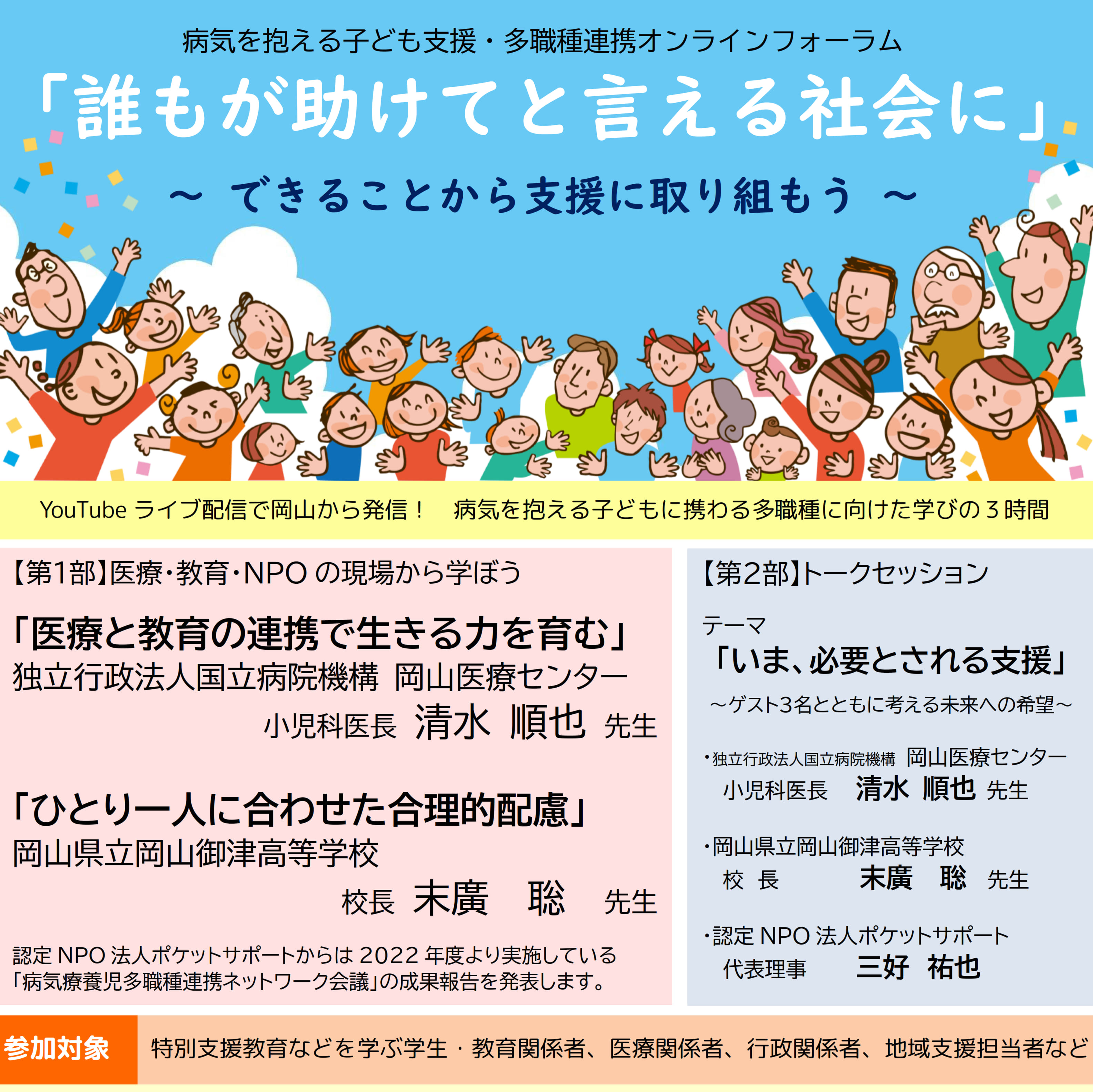 認定NPO法人ポケットサポート(岡山県岡山市、代表理事:三好 祐也)は、2023年2月26日(日)にYouTubeライブ配信にて『病気を抱える子ども支援・多職種連携オンラインフォーラム』を開催します。