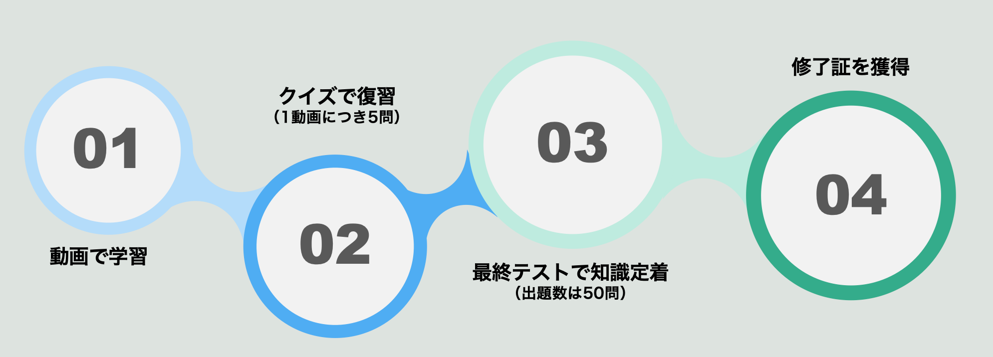 本eラーニングは単元ごとに動画とクイズを用意。受講者は効率的な学習が可能。PC・スマホなどデバイスフリーなので、お好きな時間・場所で受講ができる点が特長です。