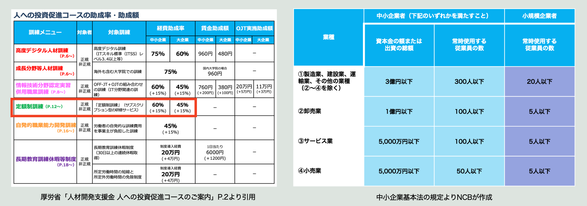 定額受講コースの受講料は、厚生労働省「人材開発支援助成金 人への投資促進コース - 定額制訓練」の支給対象経費となります。