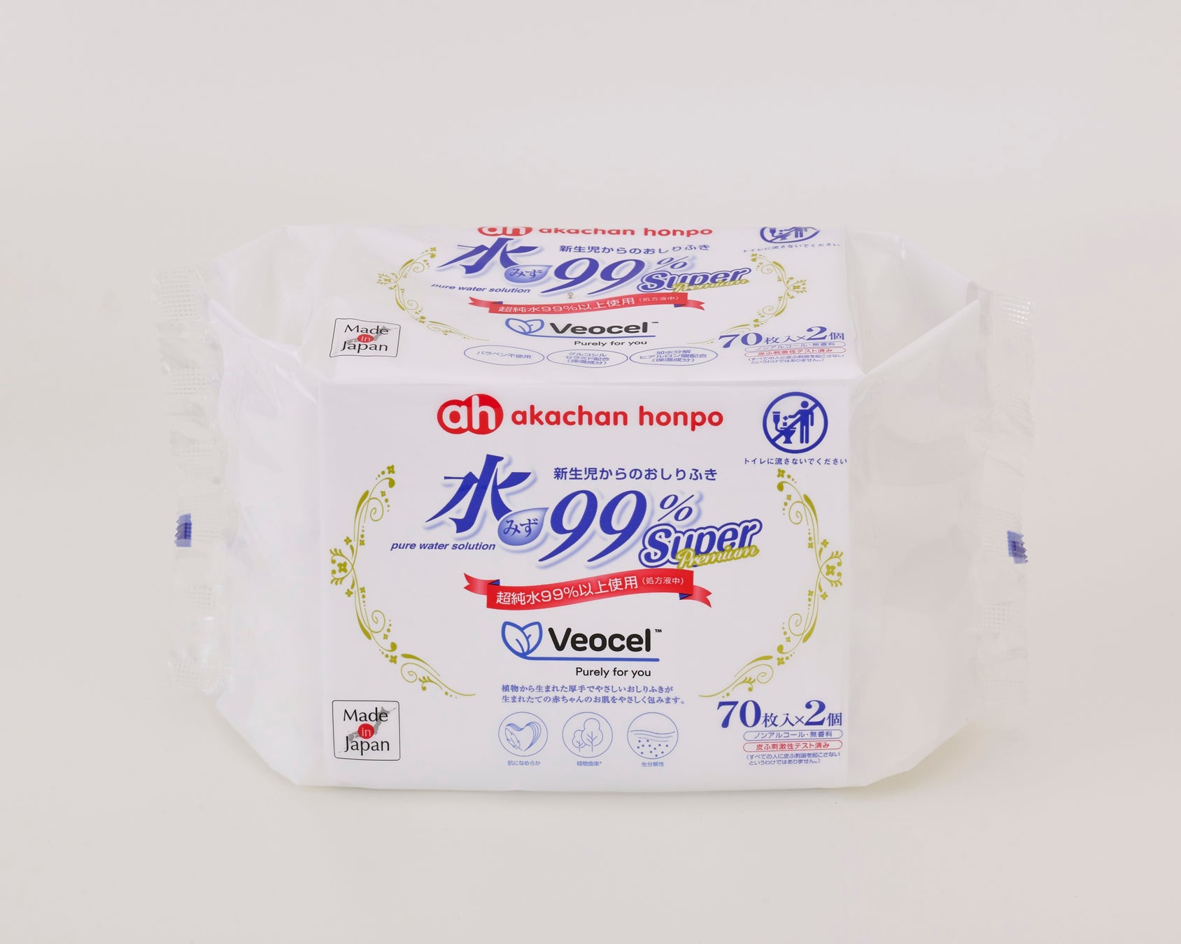リニューアルした「水99%Super Premium おしりふき」のパッケージにはヴェオセル™繊維を新たに表記して、12月17日(金)より全国のアカチャンホンポとネット通販「オムニ7」( https://akachan.omni7.jp )にて発売されます。
