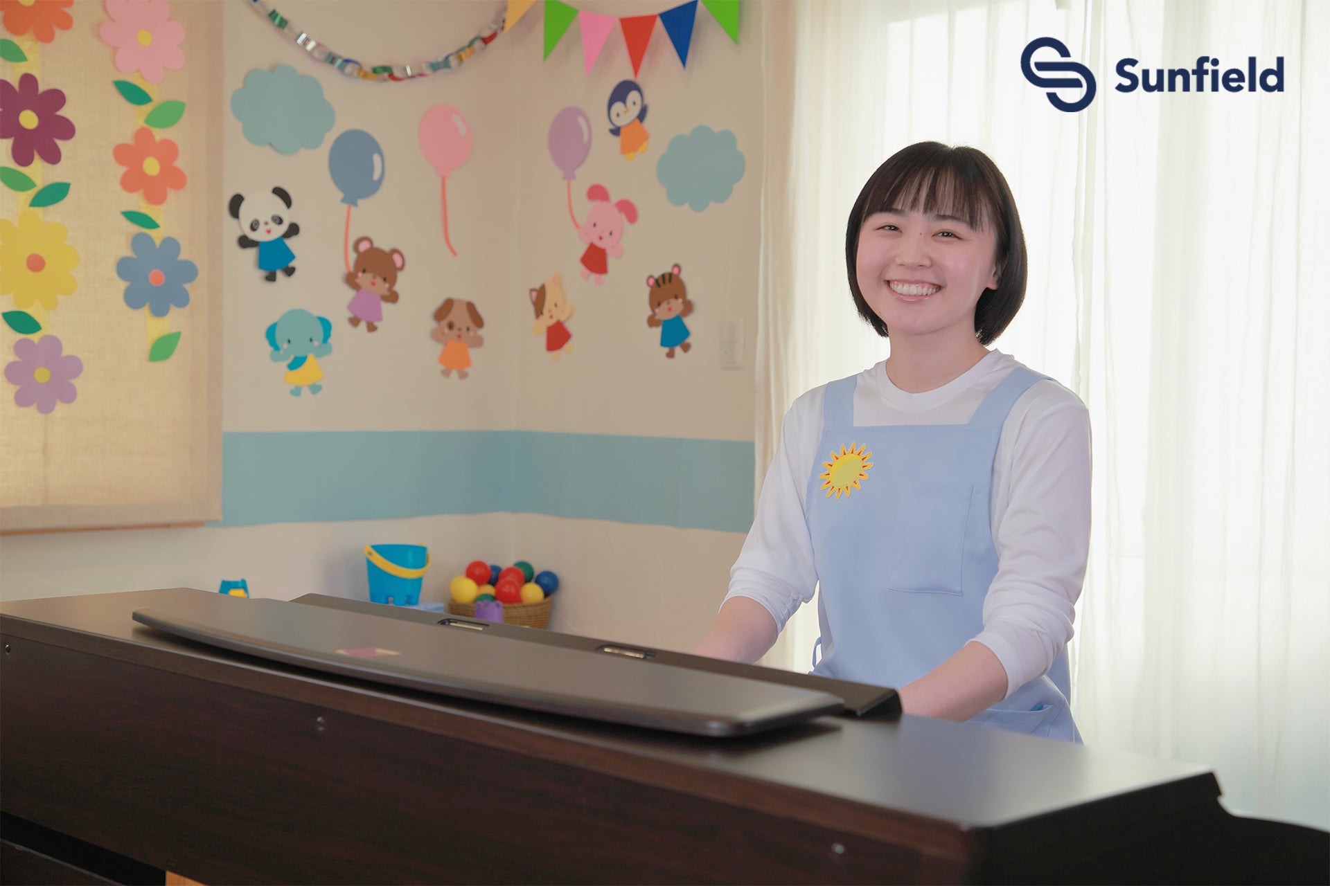 園児に向けてピアノを弾きながら歌うことで、サービス内容と共に株式会社サンフィールドの親しみやすさをお伝えします。