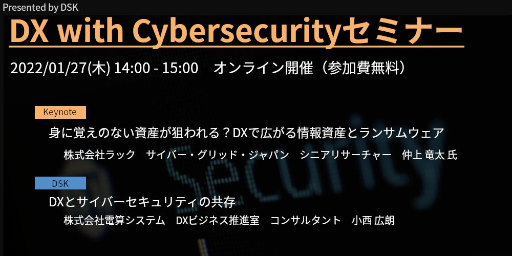 株式会社電算システム(本社:岐阜県岐阜市、代表取締役社長執行役員:高橋 譲太 以下「電算システム」)は、経営・マネージメント層を対象にDX with Cybersecurityをテーマにしたオンラインセミナーを2022/1/27(木)に開催いたします。