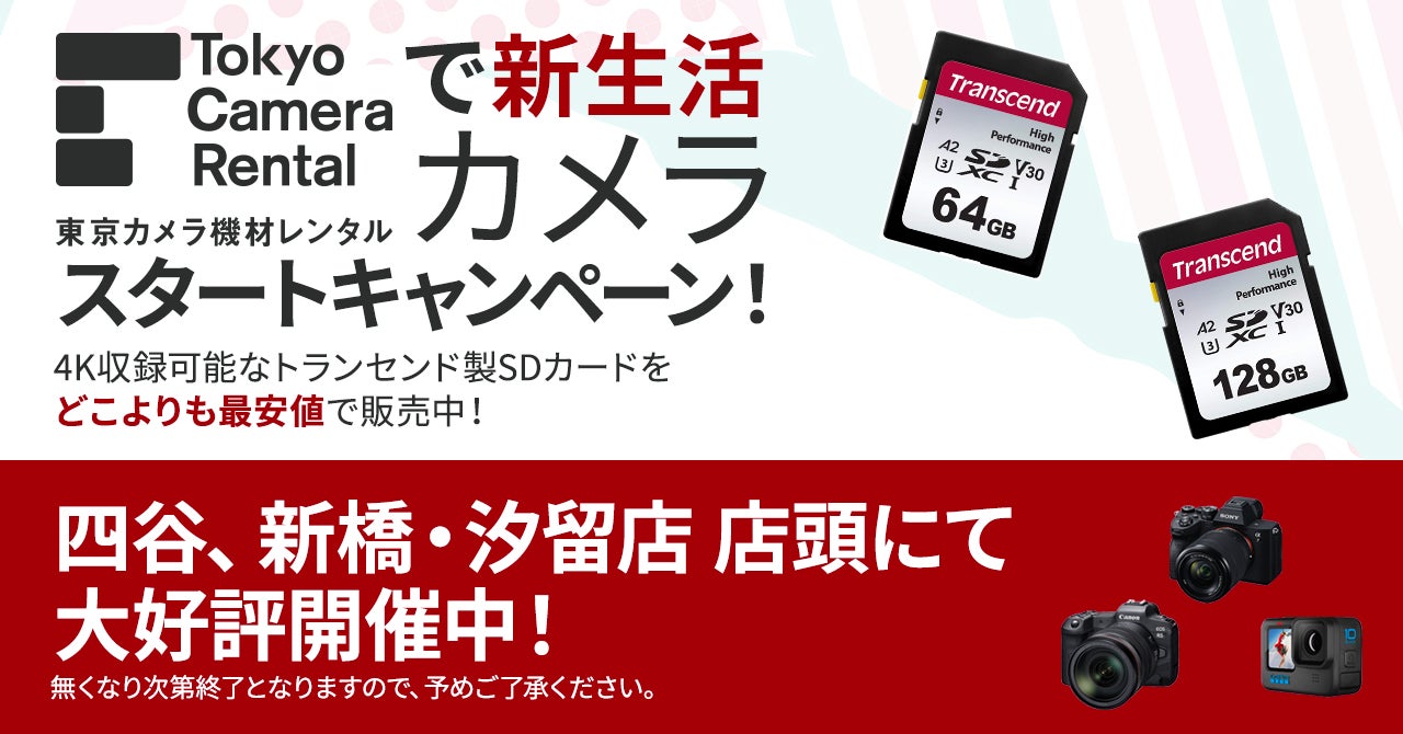 東京カメラ機材レンタルは新しい一歩を踏み出し新生活をはじめる皆様に向けて、四谷店、新橋・汐留店店頭にて「TCRで新生活カメラスタートキャンペーン!」を開催し新たな門出をお祝いいたします。トランセンド様の4K収録可能なSDカードを大特価で販売させていただきます。この機会にぜひ東京カメラ機材レンタルのキャンペーンやサービスをご利用ください。