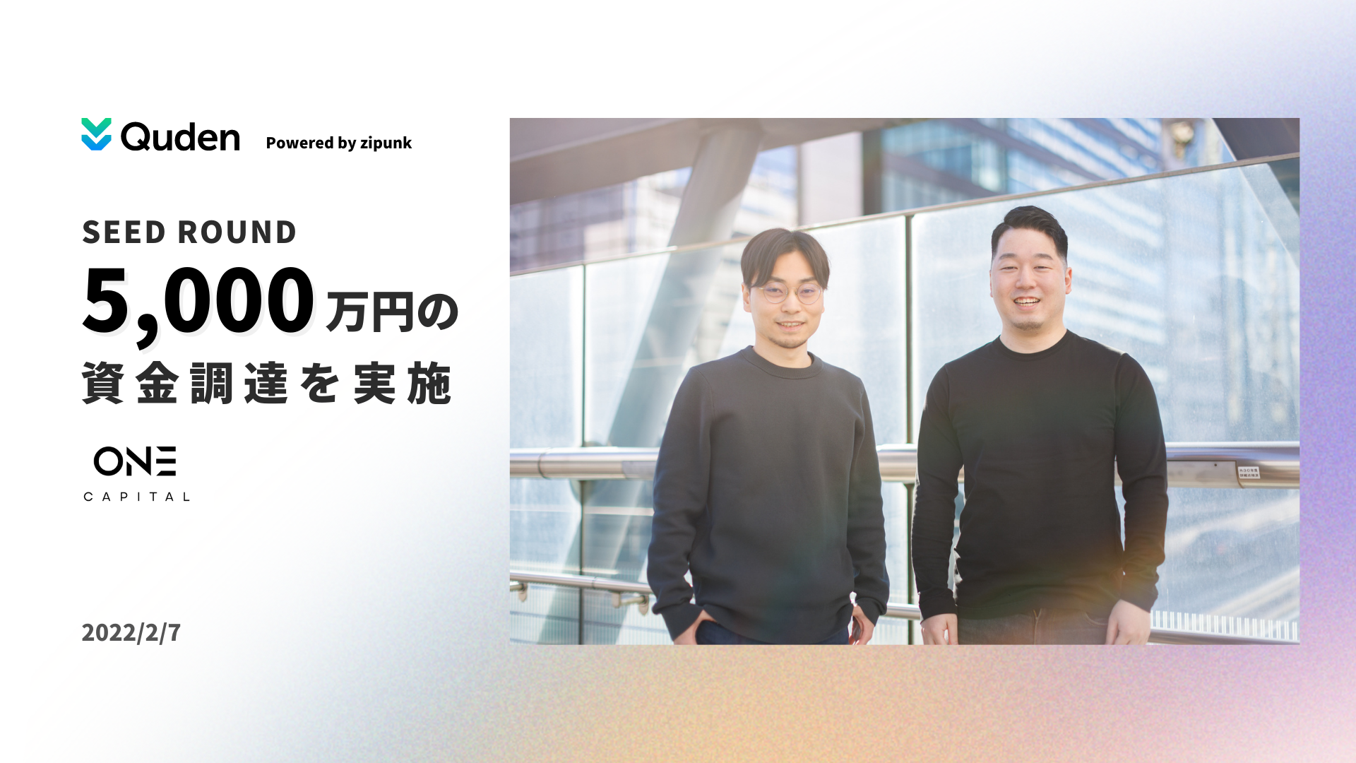 B2BビデオコラボレーションSaaS「Quden ( https://www.quden.io )」を提供する株式会社ジパンク(本社:東京都渋谷区、代表取締役:兵藤 佑哉、以下「当社」)は、この度One Capitalからシードラウンドで5,000万円の資金調達を実施したことをお知らせいたします。また2022年2月よりプランや機能の拡充を伴うQudenの正式リリースを実施したことをご報告いたします。