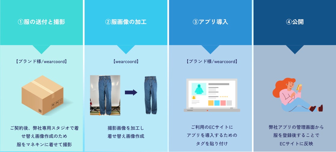 アパレル企業様で販売している商品を、当社スタジオにて異なる体型や身長のマネキンに着用させ撮影したものを画像化し、「wearcoord」に取り込むことでリアルなサイズ感を表現した試着コーディネート機能の利用が可能となります。