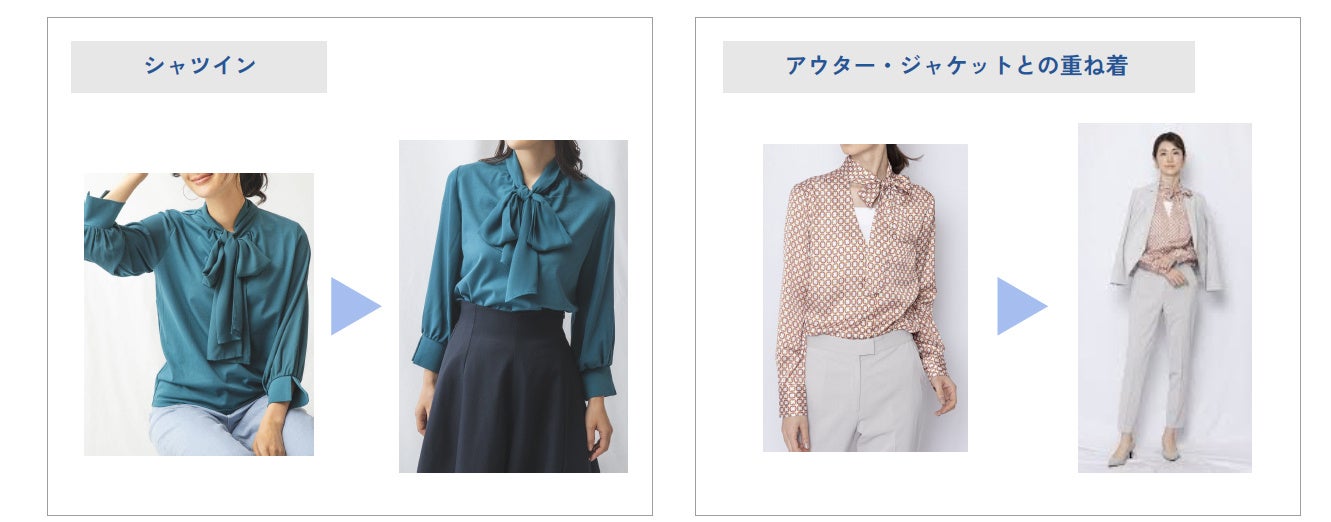 また、予めシャツをパンツにインした画像やジャケットを重ね着した画像を撮影しておくことで様々な着こなしを確認できます。