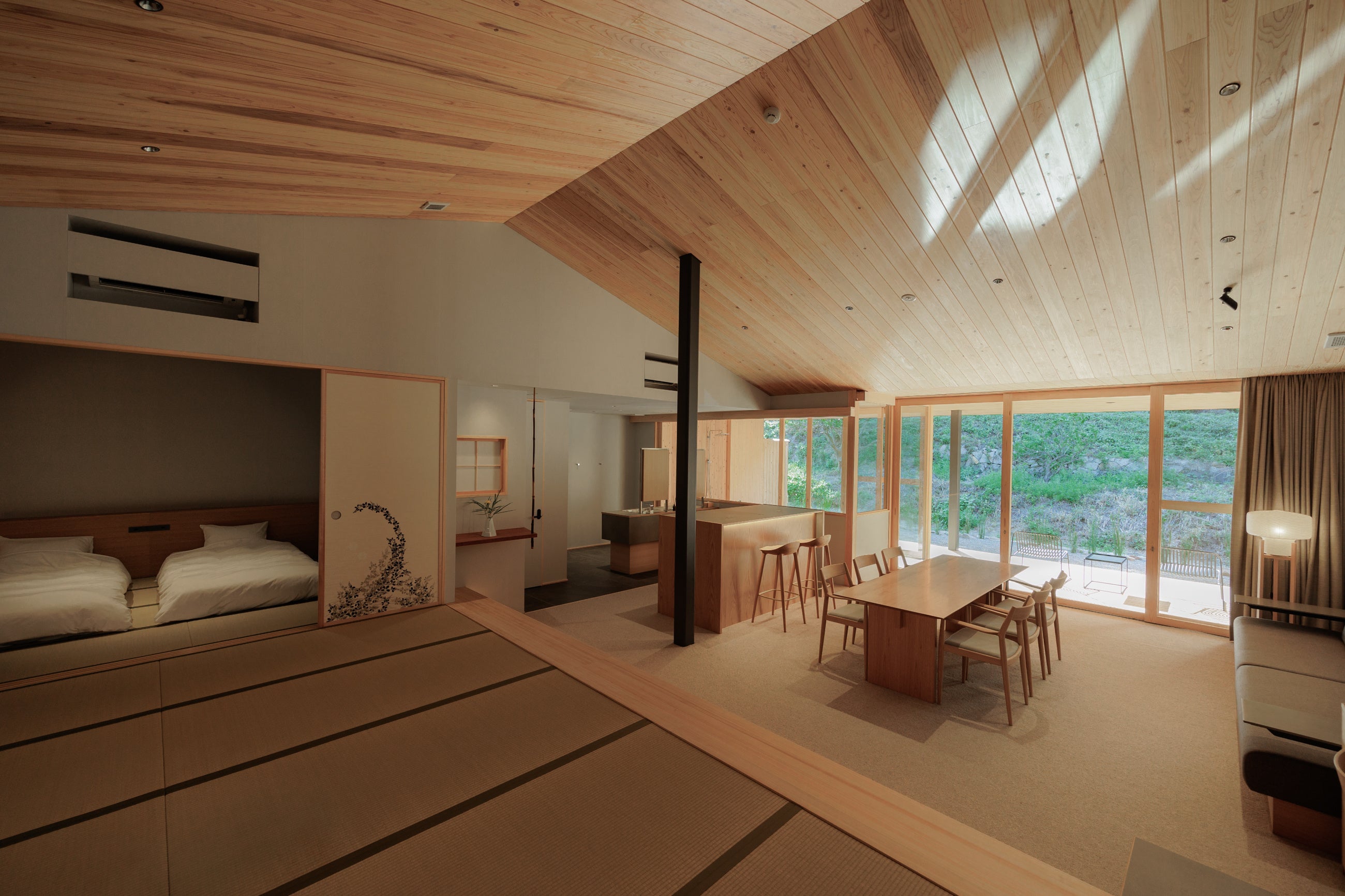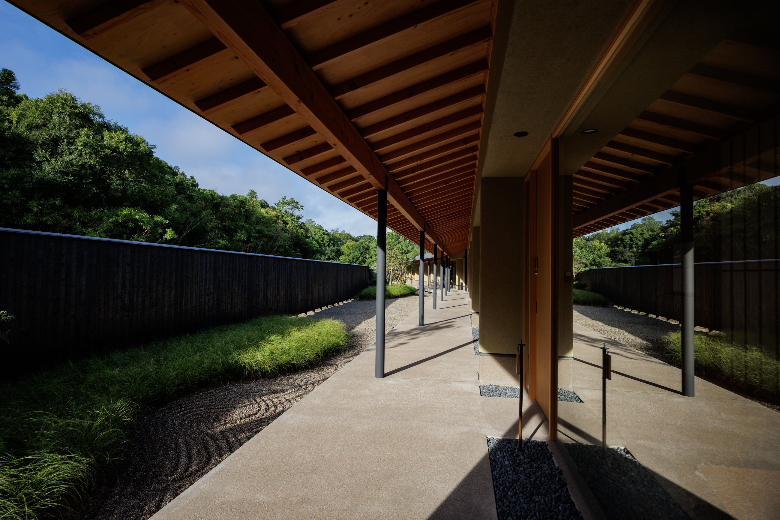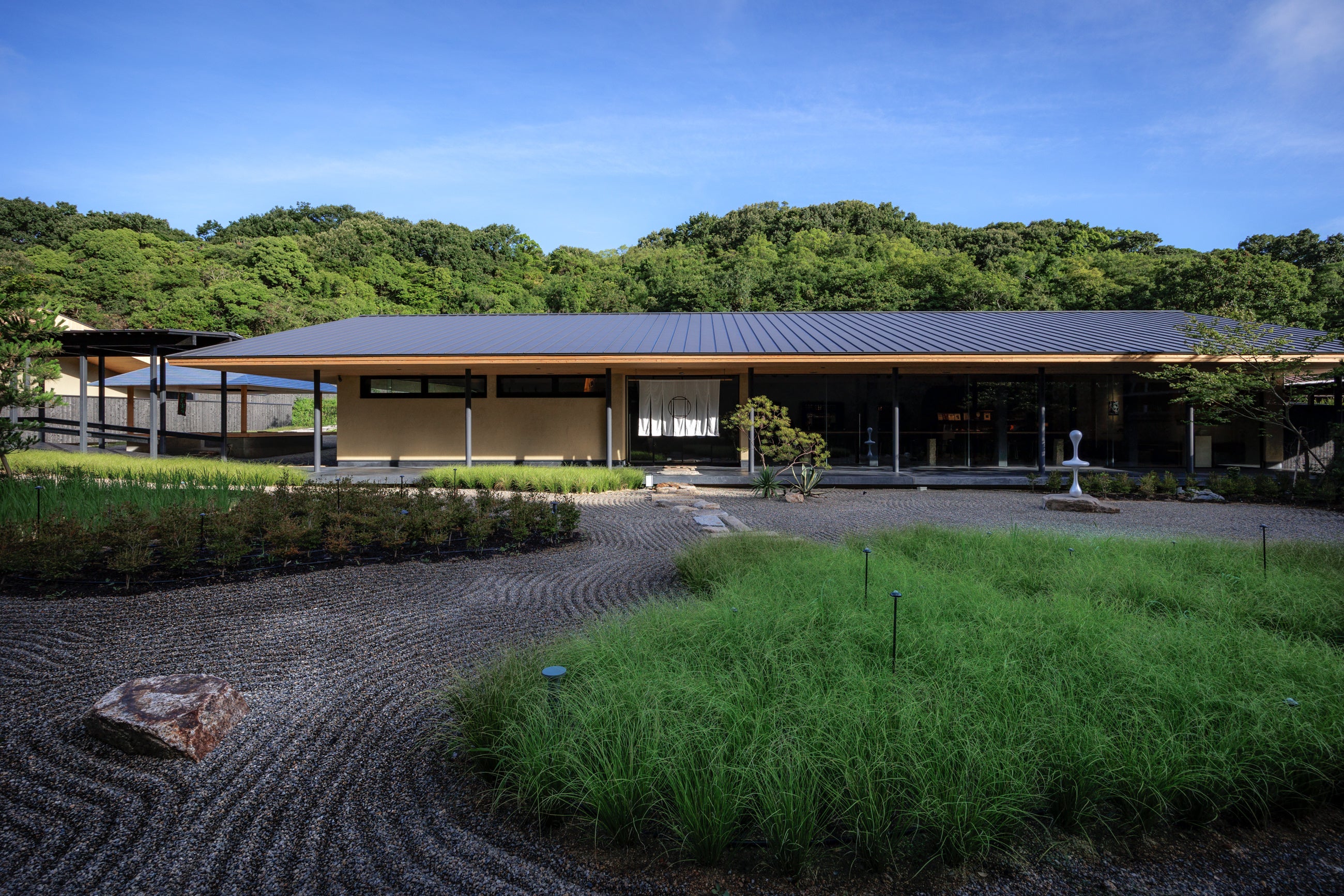 建築は「里山の風景」のコンセプトのもと、日本古来の美意識である「質素美」と「内と外の曖昧さ」を基本デザインに置き、地域と隔絶した豪奢な建物を作るのではなく、敷地奥に昔から広がる山林を借景とした平家とすることでその土地に馴染み、自然と調和した宿としました。素材選びや建設工程など細部にまでこだわり、グローバルに求められる旅館の快適さと、亭主の「数奇」をバランスよく取り入れた建築となっています。