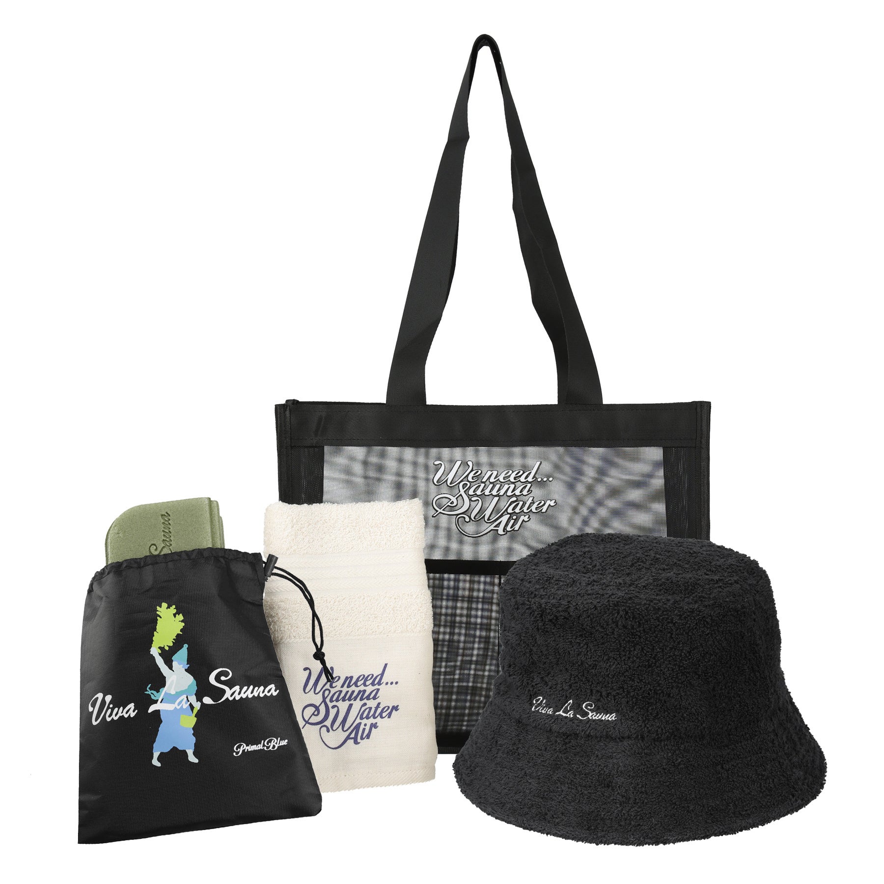 サウナハット、サウナマット、タオル、メッシュトートバッグの4点がセットになったサウナ入門キットです。