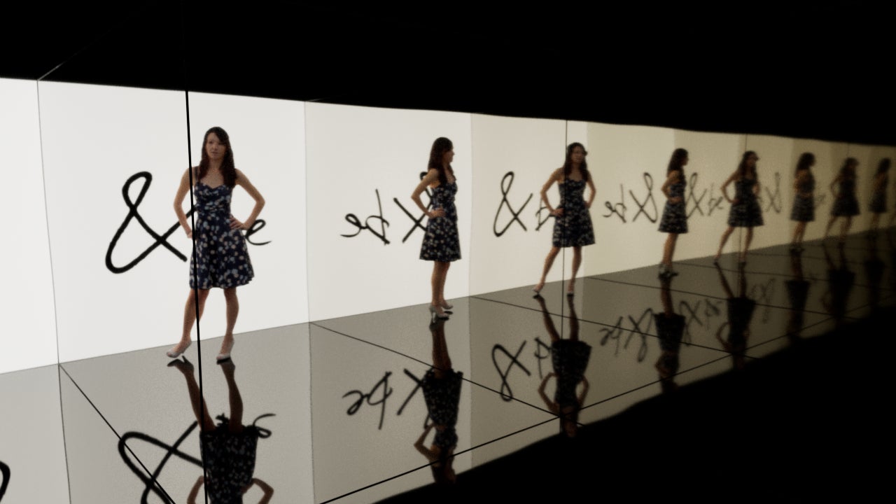 向かい合わせになった巨大な鏡と映像を使用して幻想的で不思議な空間を生み出す、
