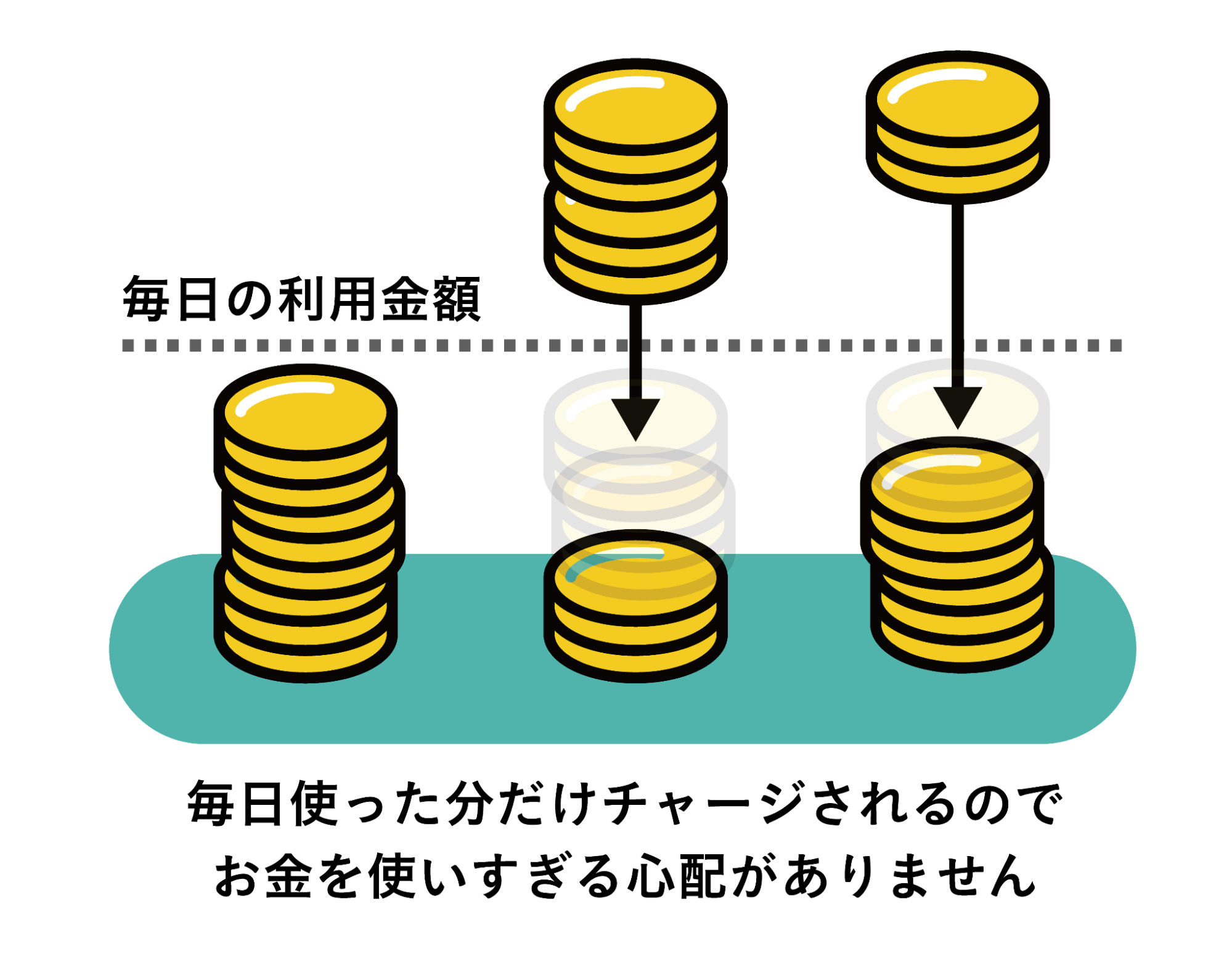 2.あらかじめ決められた金額が自動でチャージされるプリペイドカードで、使いすぎる心配がない
