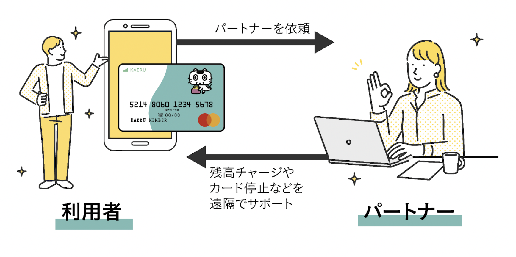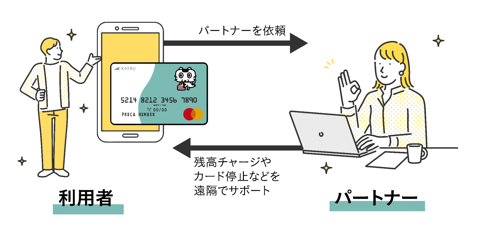 オプションで利用できるパートナー機能は、利用者のご家族などが連携できる機能で、パートナー設定をすると、カードを使い始めるための設定や紛失時の対応など、すべてパートナーにお任せすることができます。