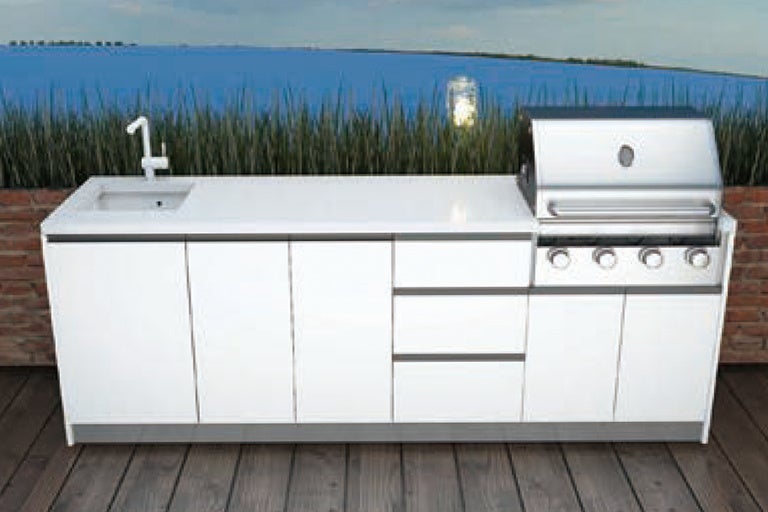 ●BBQのために必要なガスグリルやゴミ箱(不燃ゴミ、燃えるゴミ)、カトラリーや皿、スキレットを収納する3段の引き出しを備えた、上品さを演出したステンレス製アウトドアキッチン。