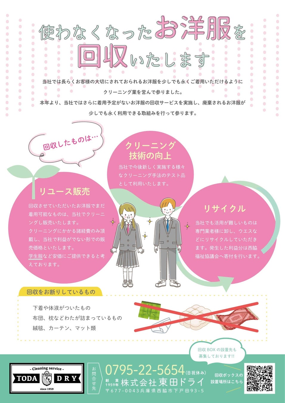 株式会社東田ドライ(代表取締役社長:東田伸哉 本社:兵庫県西脇市)は、自社で運営するクリーニング店(兵庫県西脇市、丹波市)5店舗において不要衣類回収サービスを開始したことをお知らせいたします。