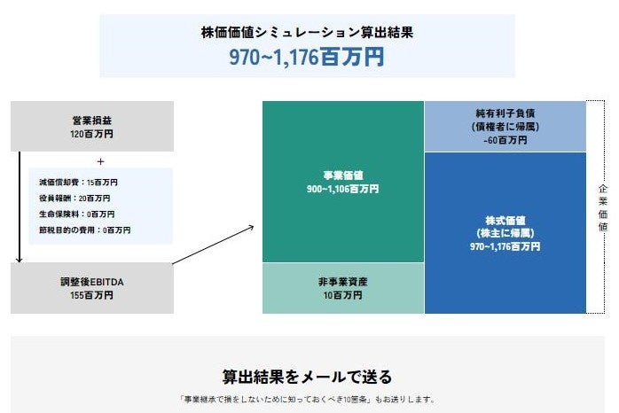 正しく買い手の株式価値評価手法を理解することは、売り手オーナーがご自身の利益を守るために非常に大切なことです。そこで当社は、買い手が実際に用いる計算手法である「類似会社比較法」に基づいて株式価値を概算する株価シミュレーターを開発し、公開致しました。