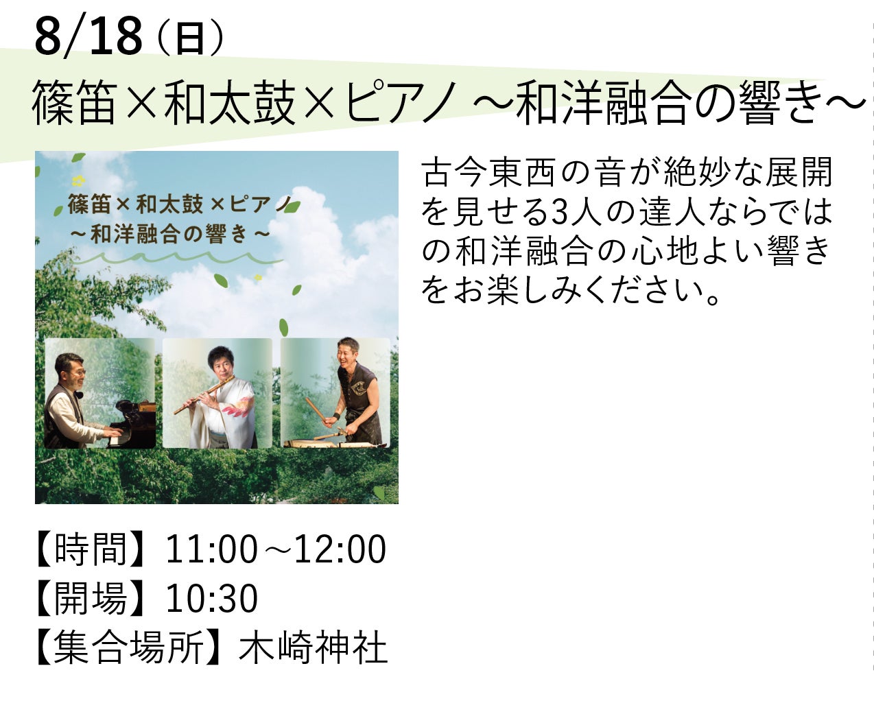 出演者 NAKIBEMBE EMBAIRE GROUP、【鼓童】小島千絵子、船橋裕一郎、小松崎正吾、三浦康暉、米山水木、前田順康、三枝晴太、平田裕貴、小野田太陽、新山萌、廣嵜一馬、小川蓮菜、勝部しずく
