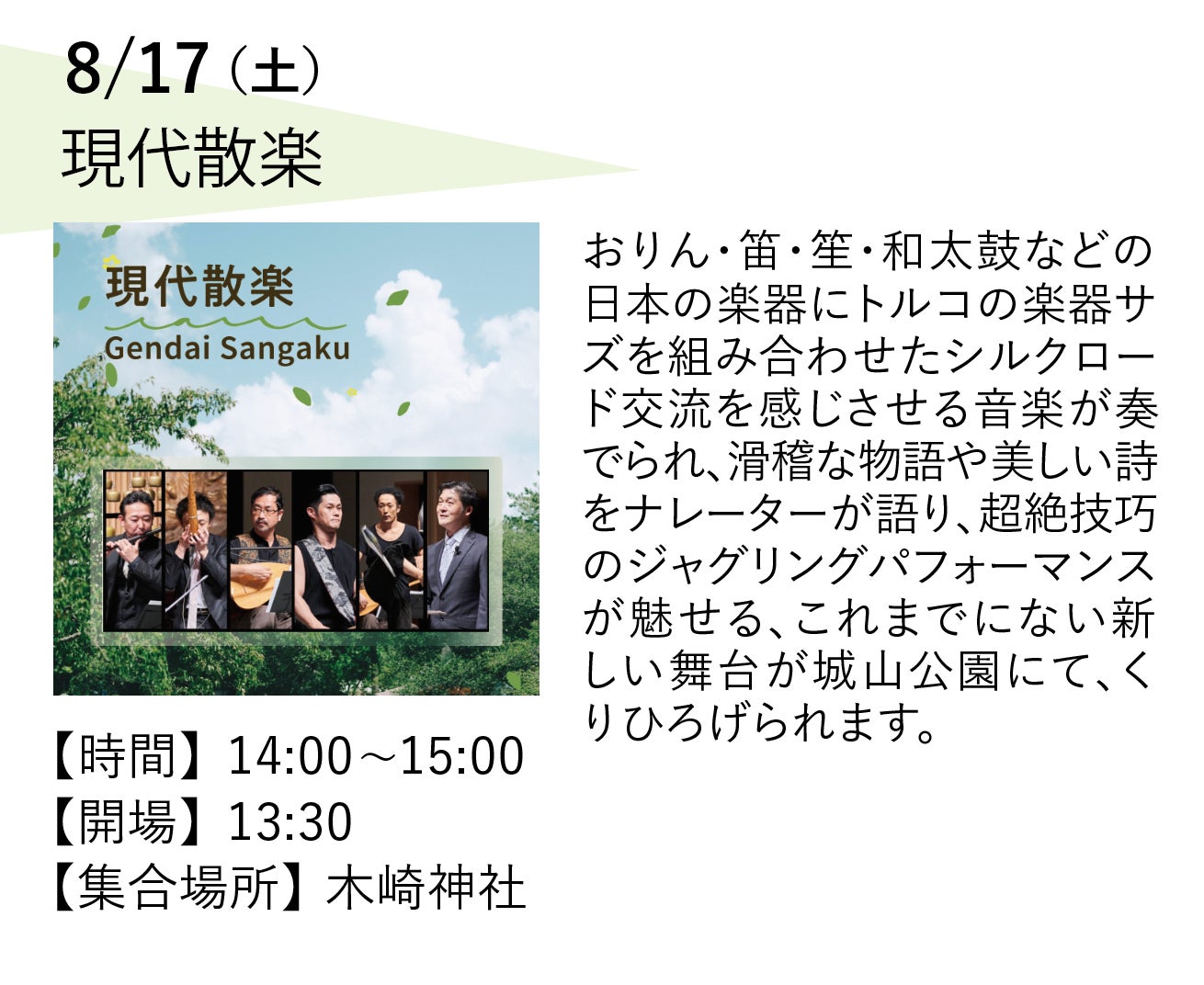 昨年、新たなアクティビティフィールドとして復活した城山公園。今年は城山の自然と音楽をより味わっていただきたいと城山での野外ミニライブ「城山パークセッション」が新たに登場 !8/17(土)、18(日)の2日間、3つの多彩なラインナップをご用意。城山で音と自然とが一つになる心地よさ、その解放感をどうぞご堪能ください !