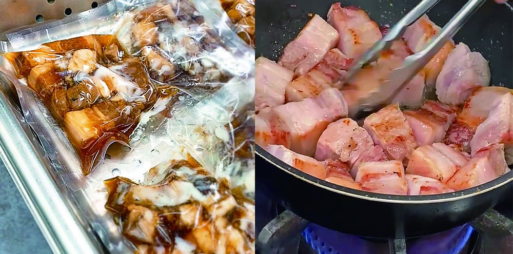 真空調理の低温加熱だけでは生み出せない風味や食感を、真空前の調理法によって補っています。