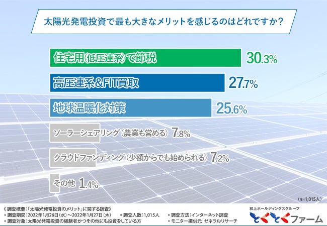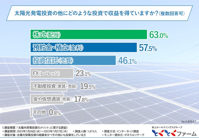 そこで今回、太陽光発電事業のセカンダリー市場サイト『とくとくファーム』(https://wajo-holdings.jp/farm/)を運営する株式会社和上ホールディングス(https://wajo-holdings.jp/)は、太陽光発電投資の経験者かつその他にも投資をしている方を対象に、「太陽光発電投資のメリット」に関する調査を実施しました。