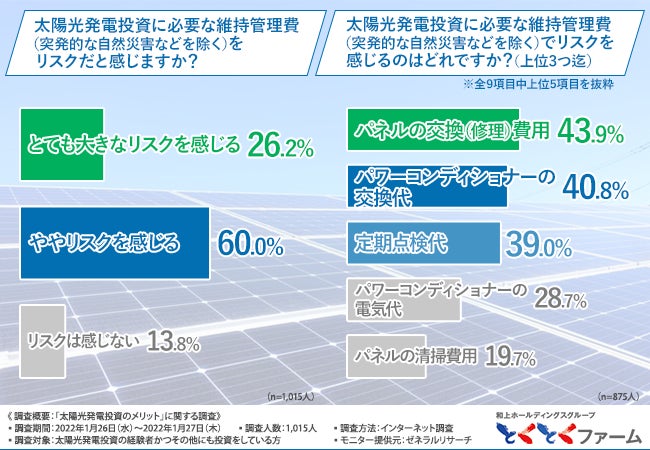 そこで、「太陽光発電投資に必要な維持管理費(突発的な自然災害などを除く)をリスクだと感じますか?」と質問したところ、8割以上が『とても大きなリスクを感じる(26.2%)』『ややリスクを感じる(60.0%)』と回答しました。