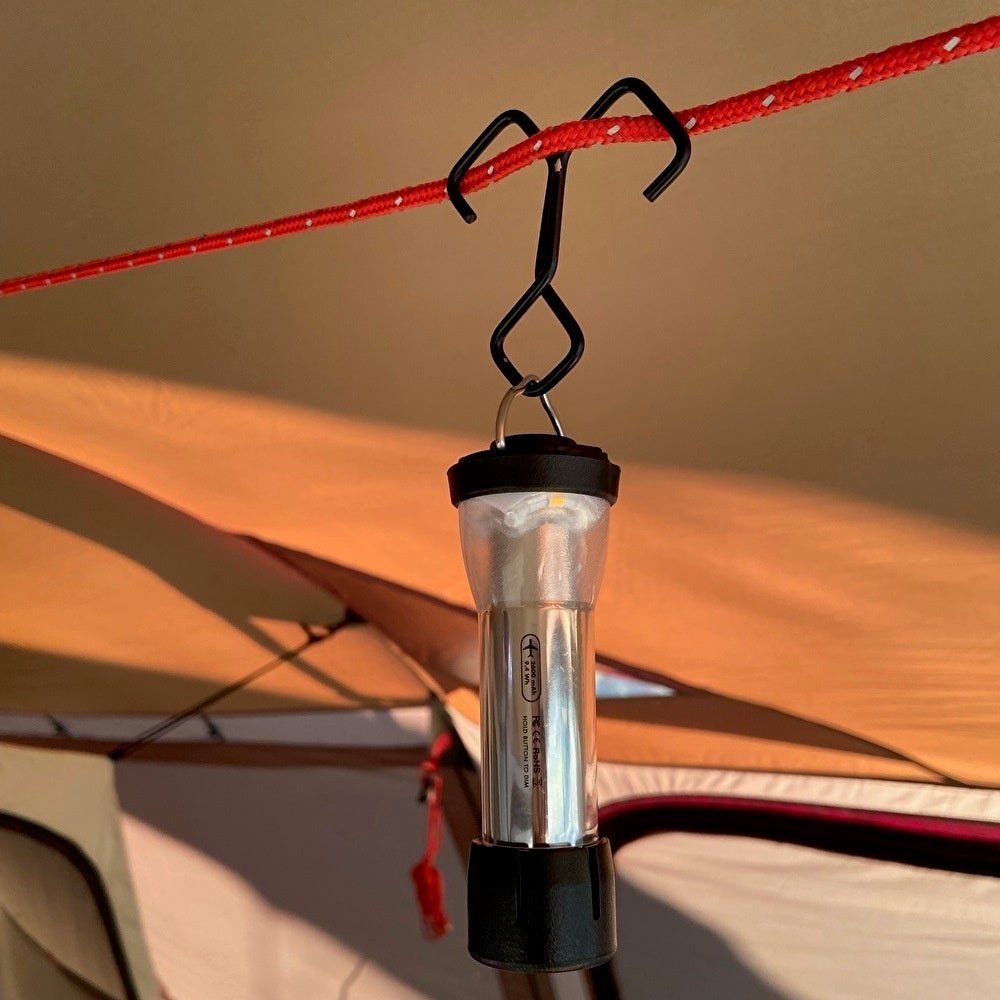 クリップ状になっているのでぐらつくことなく生地にフィットします。他にも幕内やタープ下のガイロープに簡単に掛けられるので、ランタンや小物を吊るすのにも非常に適しており、左右の移動もラクチンです。あらゆるシーンで使えるギアとなっています。