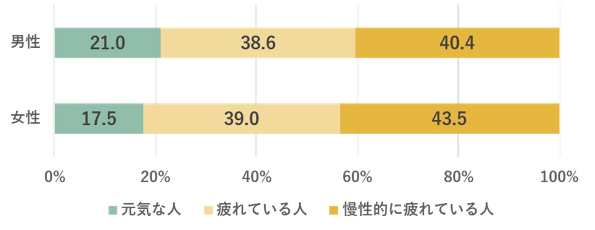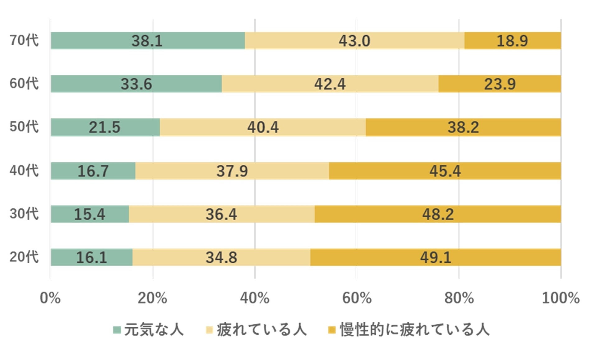 現役世代内では40代が境となりますが、とくに20代・30代女性は「元気な人」がわずか1割。一方「慢性的に疲れている人」は5割を上回り、2021年の日本では、若い女性の疲労が深刻な状態です。