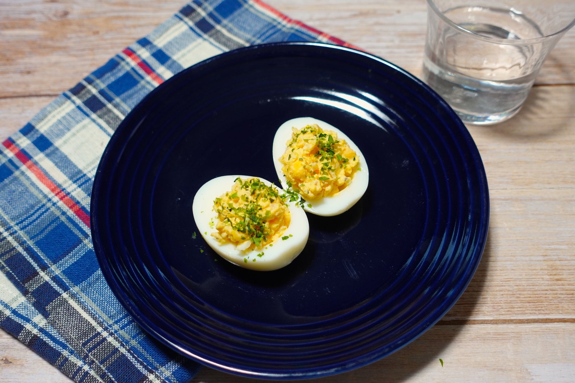 3.2のゆで卵を縦半分に切り、黄身の部分を1にほぐしながら混ぜたら塩胡椒で味を整えます。